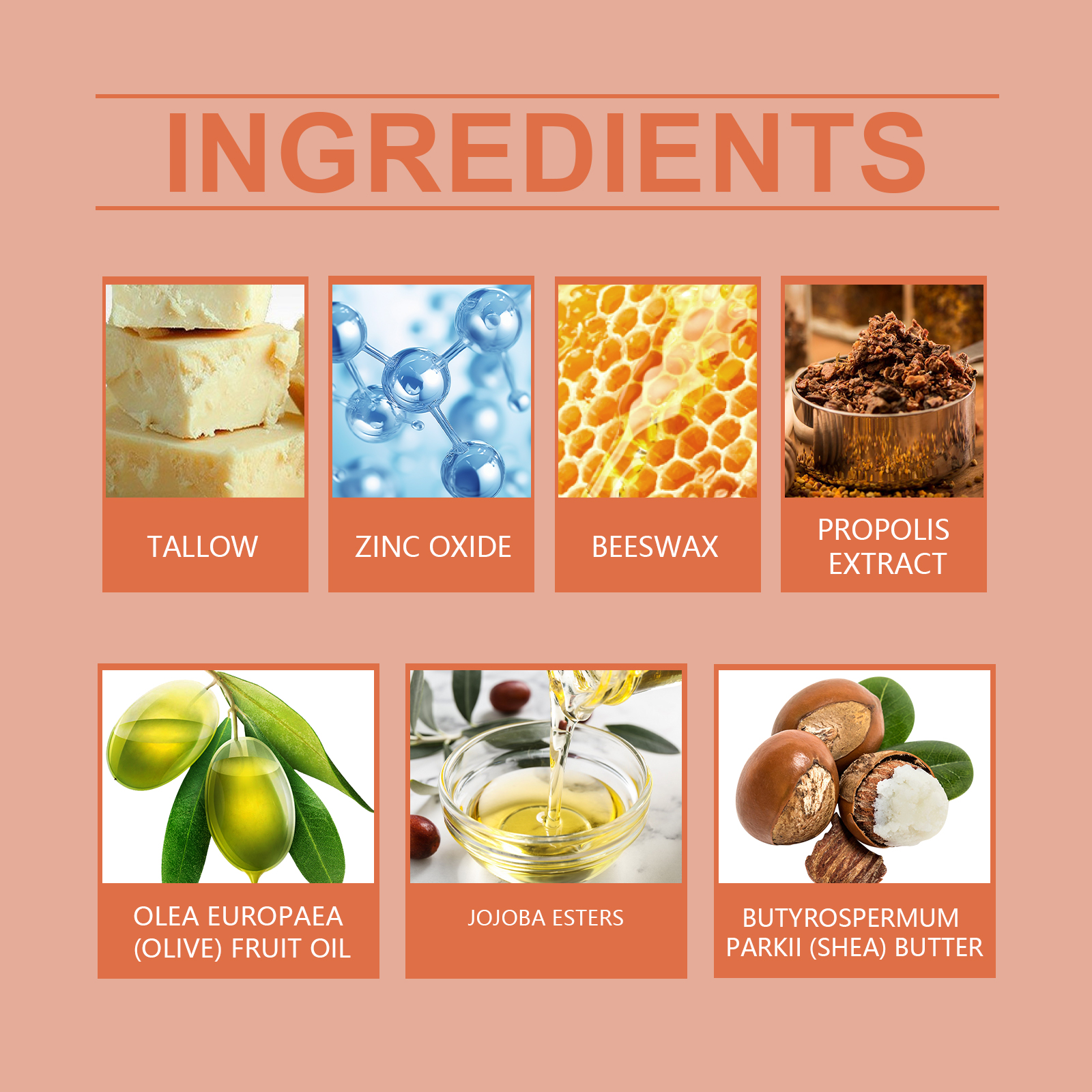 Our versatile protective moisturizer contains tallow, zinc oxide and beeswax. It can penetrate deep into the skin and lock in moisture. Provide the fatty acids needed by the skin; A protective layer can be formed to protect against UV damage. Deeply nourish skin, enhance skin elasticity, make skin smooth and delicate. Its use is simple: 1. Clean and dry the skin; 2. Apply appropriate amount of the product evenly on the skin; 3. Wait until the sunscreen has formed before going outside. Soothe the skin and speed up the repair process. Ballast oil and olive oil, continuously moisturizing, farewell to dry.