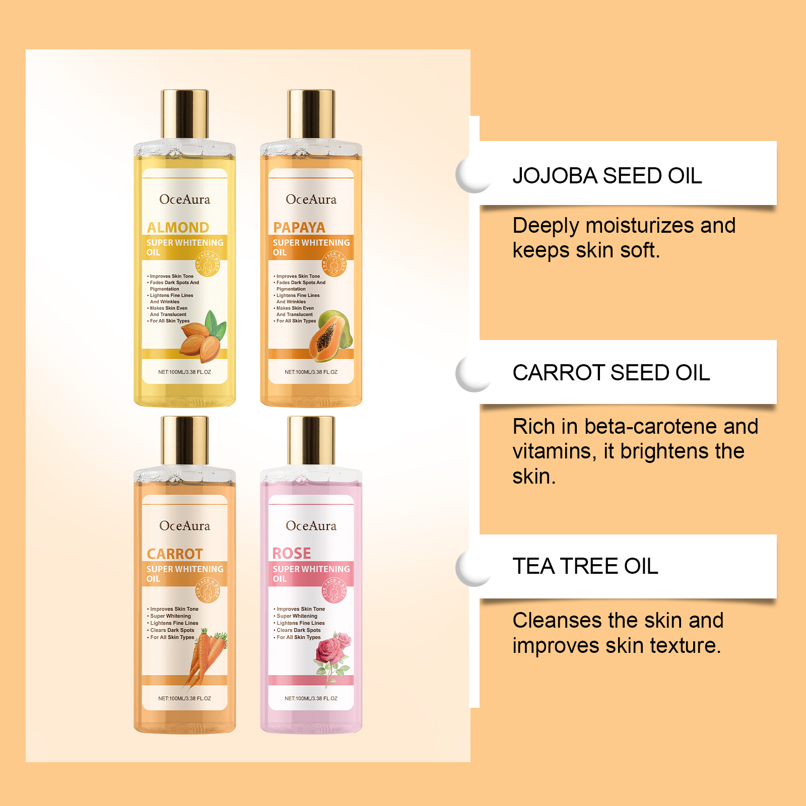 Our 7-day oils include Jojoba seed oil, carrot seed oil, and tea tree oil. It can provide deep moisture to the skin, leaving the skin soft and smooth; Helps balance the outer skin tone, improves skin whitening and luster, and shows healthy skin. The way to use it is simple: 1. Clean your skin and keep it dry. 2. Apply appropriate amount to the whole body. 3. Gently massage until absorbed. Hyaluronic acid provides long-lasting moisture, helps the skin retain moisture and prevents dryness.