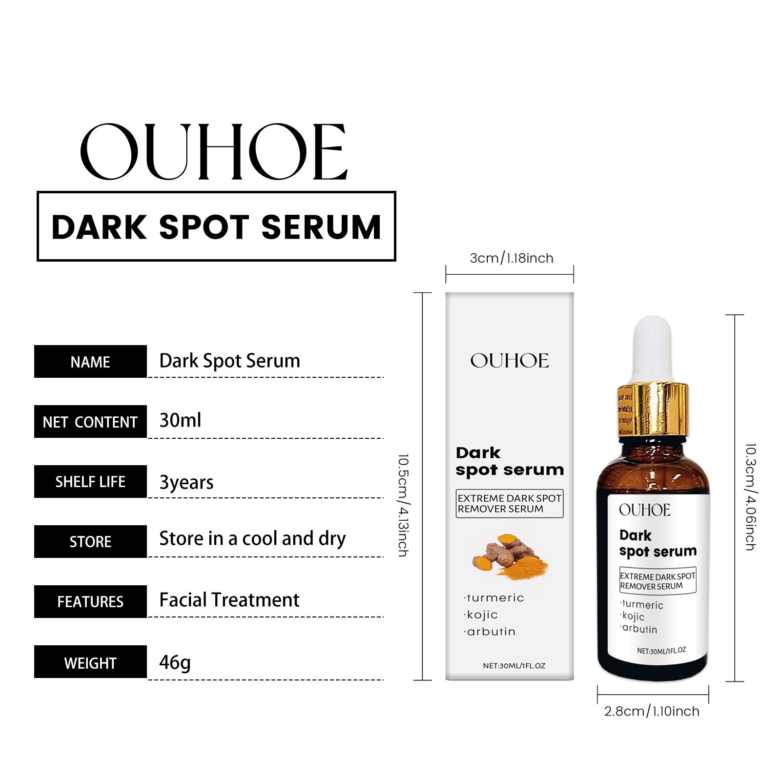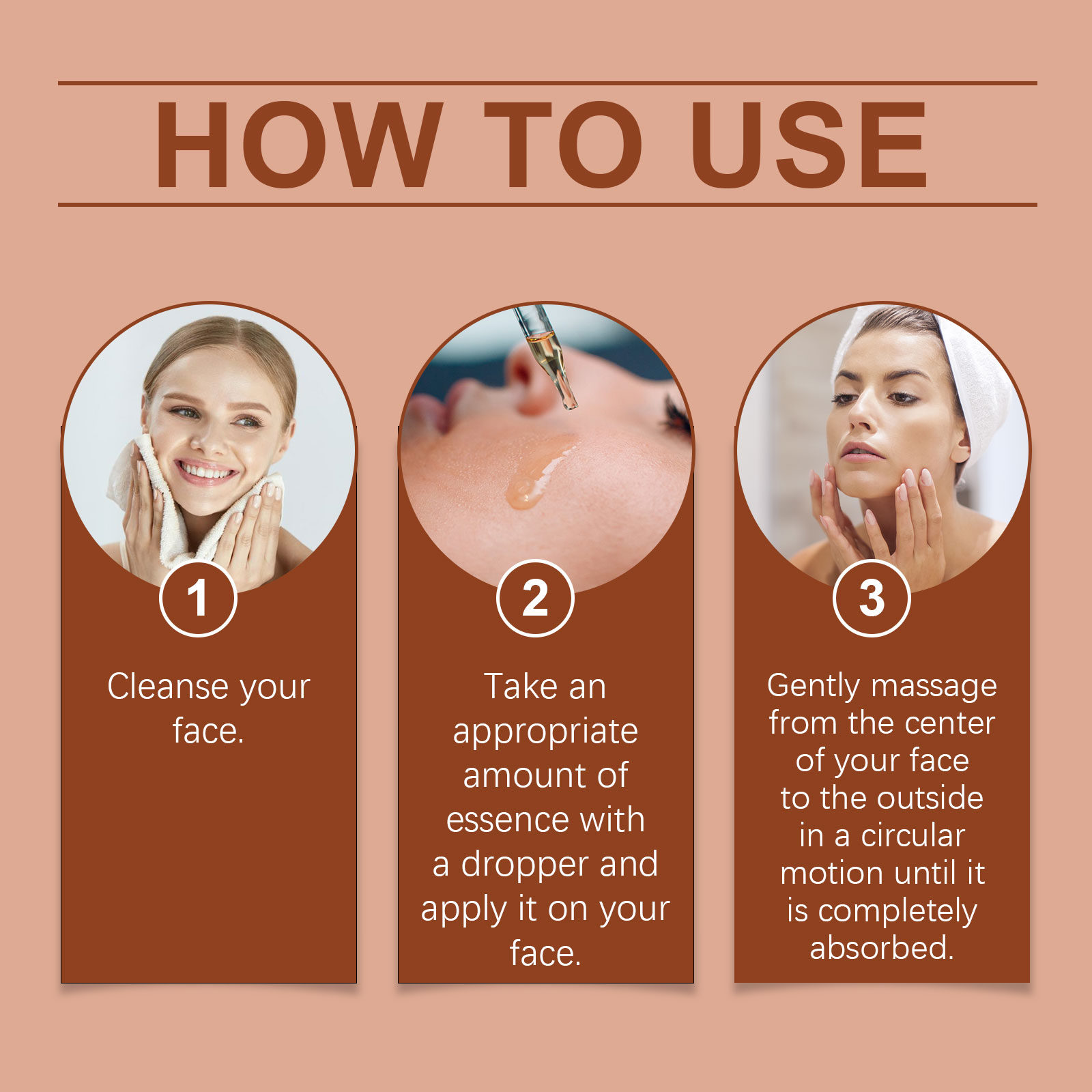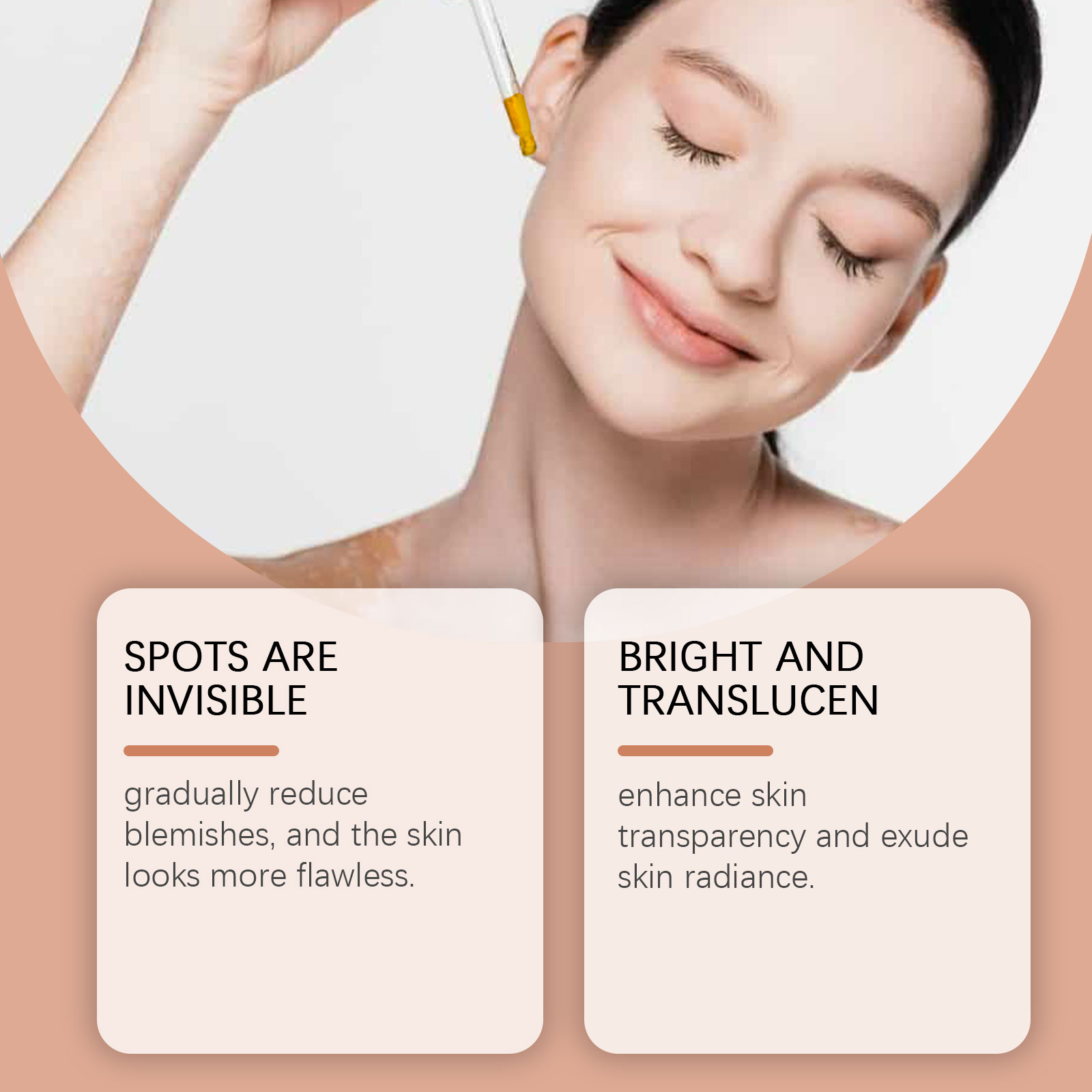 Our moisturizing serum contains kojic acid and arbutin. It can restore the luster of youth and reverse the traces of age. One touch immediately dissolved, absorption is fast, do not feel greasy. The way to use it is simple: clean your face, take a proper amount of serum with an eyedropper, apply it to your face, and gently massage it from the center of your face to the outside in a circular motion until it is completely absorbed. And gradually reduce blemishes, skin looks more flawless.