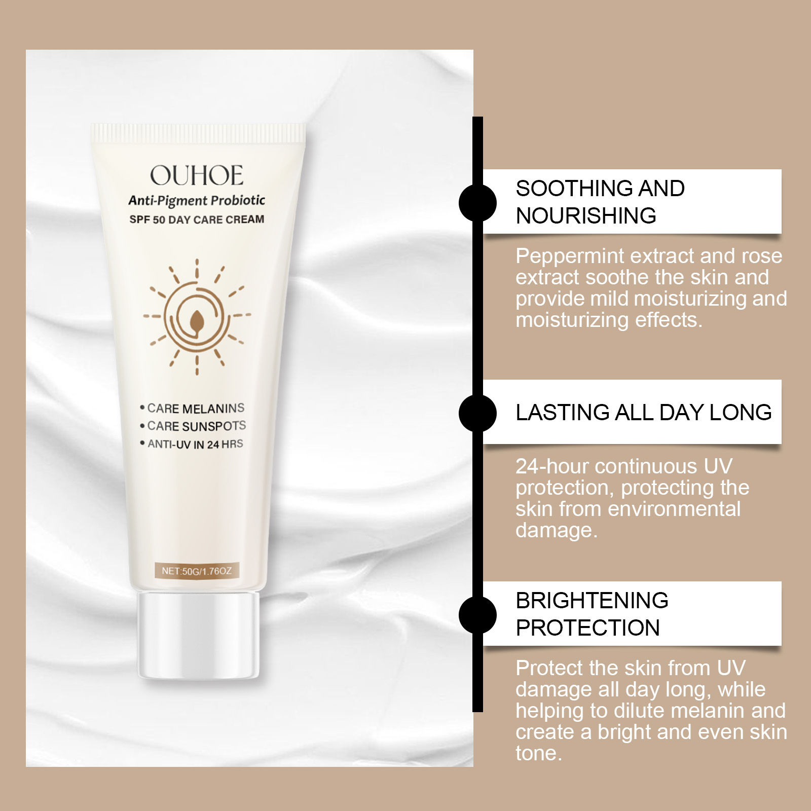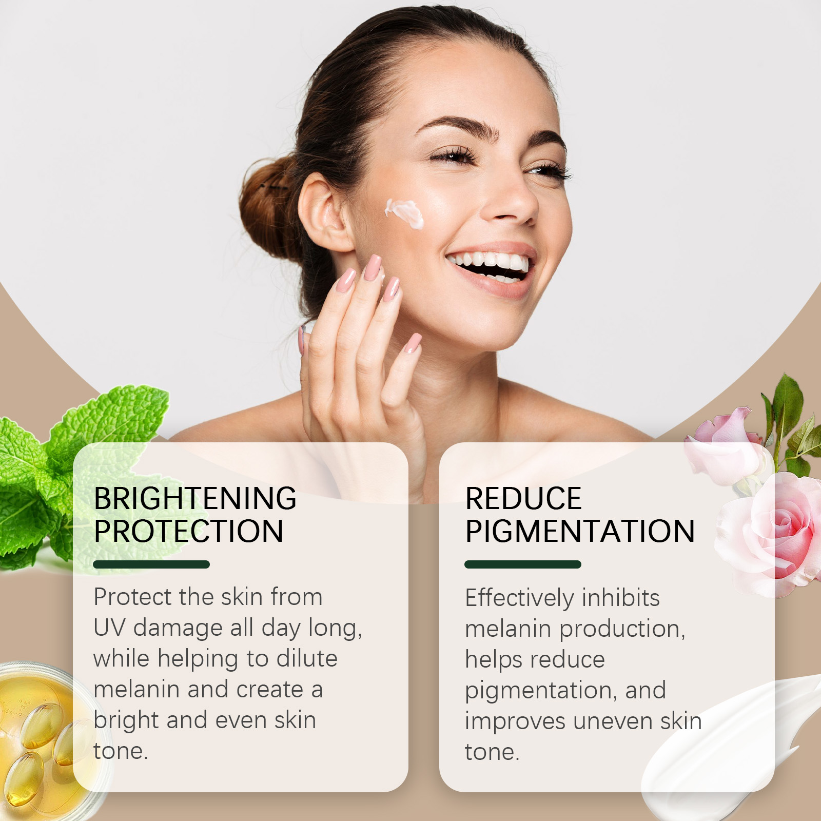 Our protective moisturizing cream contains peppermint extract, titanium dioxide. It can effectively inhibit melanin production, help reduce pigmentation and improve uneven skin tone. Its application method is very simple: clean the skin, keep the skin dry, apply appropriate amount of this product evenly on the face, gently massage until absorbed. It can also help to lighten existing pigmentation, brighten the complexion, and make your skin look more even and brighter.