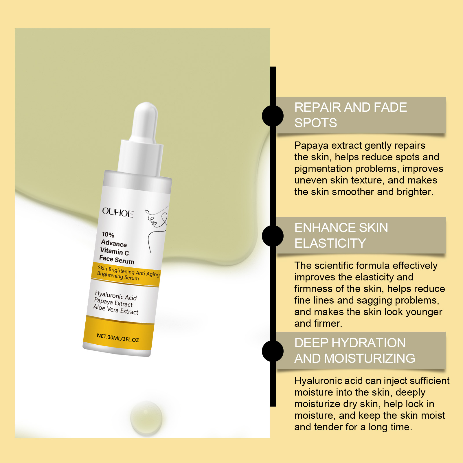 Our Vitamin C face serum contains papaya extract, aloe vera extract. It can lighten skin tone, improve dull skin tone, even skin tone, and make skin glow healthy. The way to use it is simple: clean the facial skin and keep the skin dry. Apply appropriate amount of this product evenly on the face. Gently massage until absorbed. It can also improve skin firmness and elasticity, help reduce fine lines and wrinkles, and restore your youthful glow.