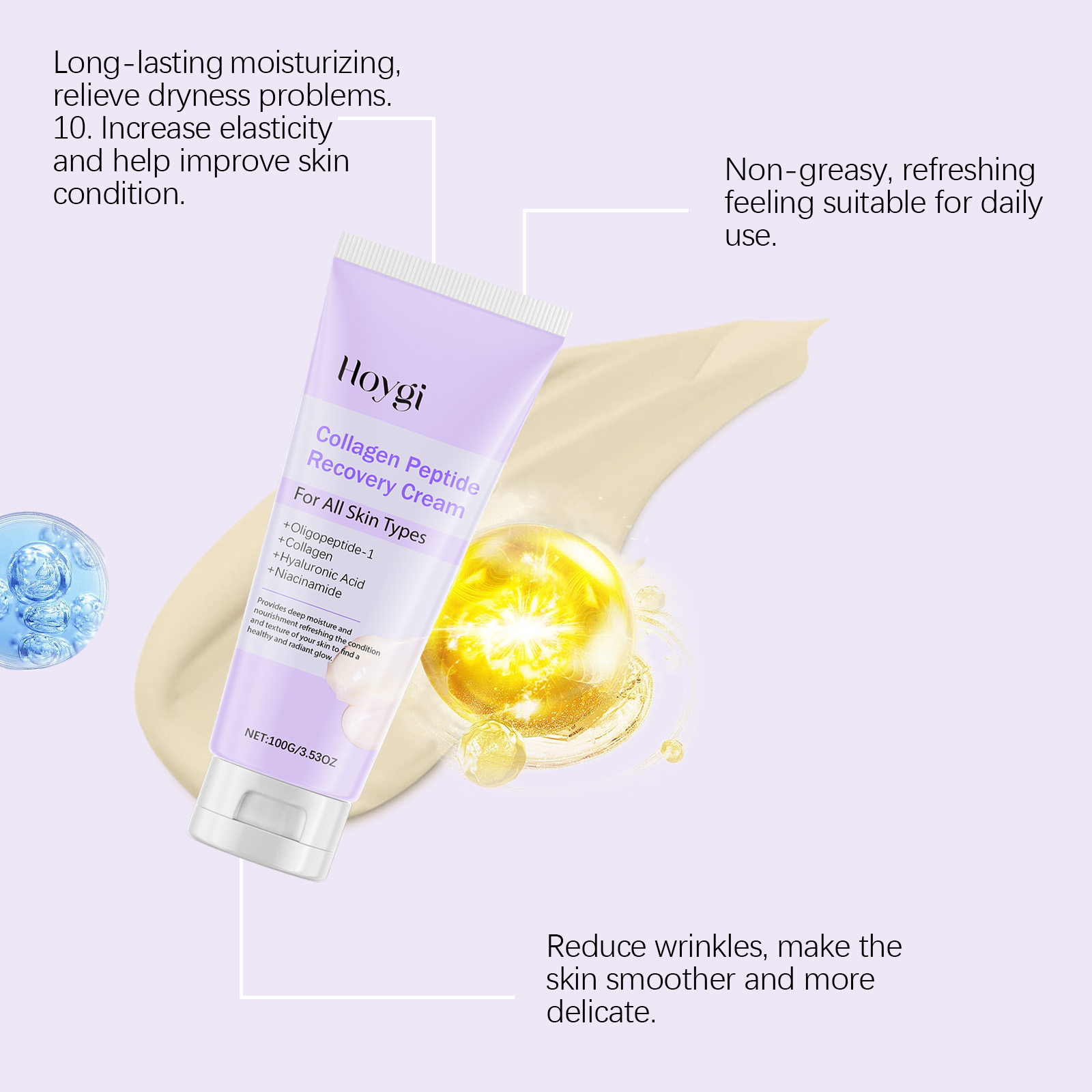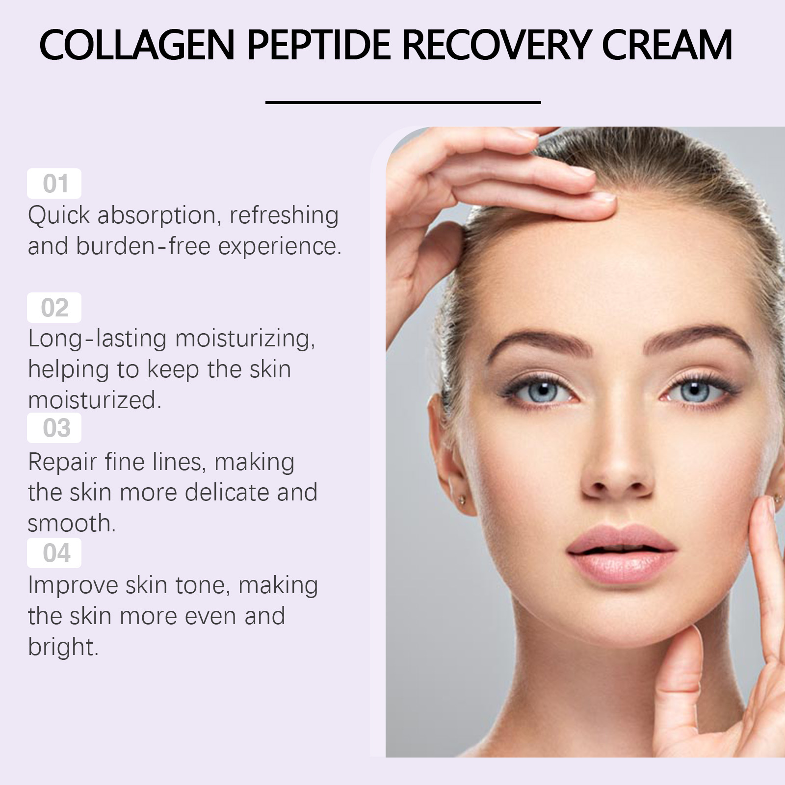 Our Collagen Peptide Light Wrinkle Repair cream contains glycerin, oligopeptide-1, collagen. It can help slow the signs of aging and keep your skin young. Effectively improve skin elasticity and create a firm feeling. The way to use it is simple: 1. Clean your face and keep it dry; 2. Apply appropriate amount to face evenly. 3. Gently massage until absorbed. Elasticity helps to plump up loose areas and firmer skin.