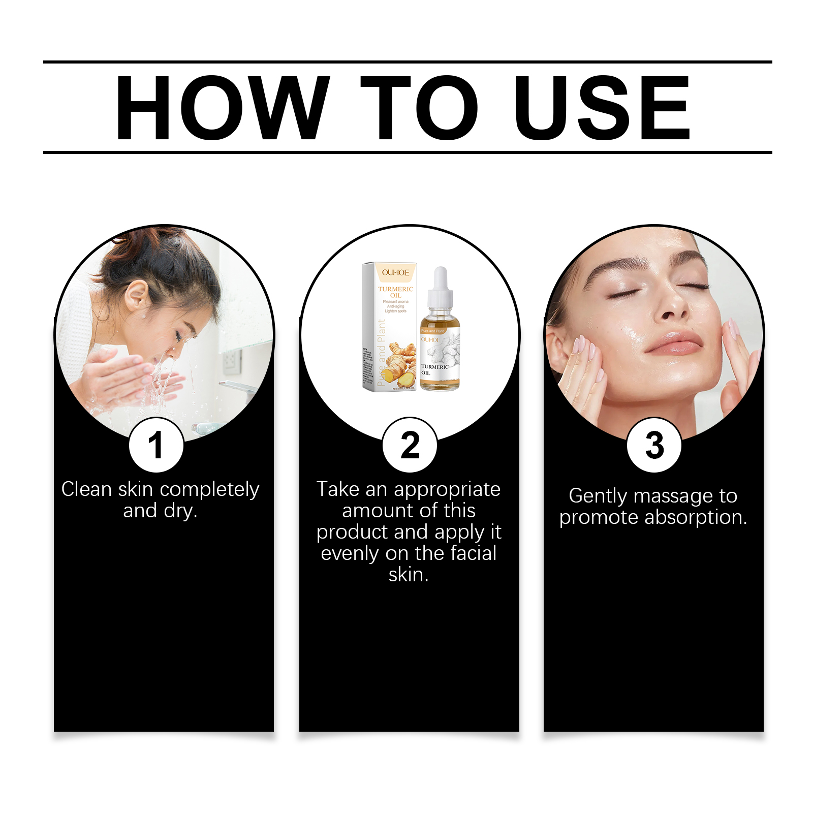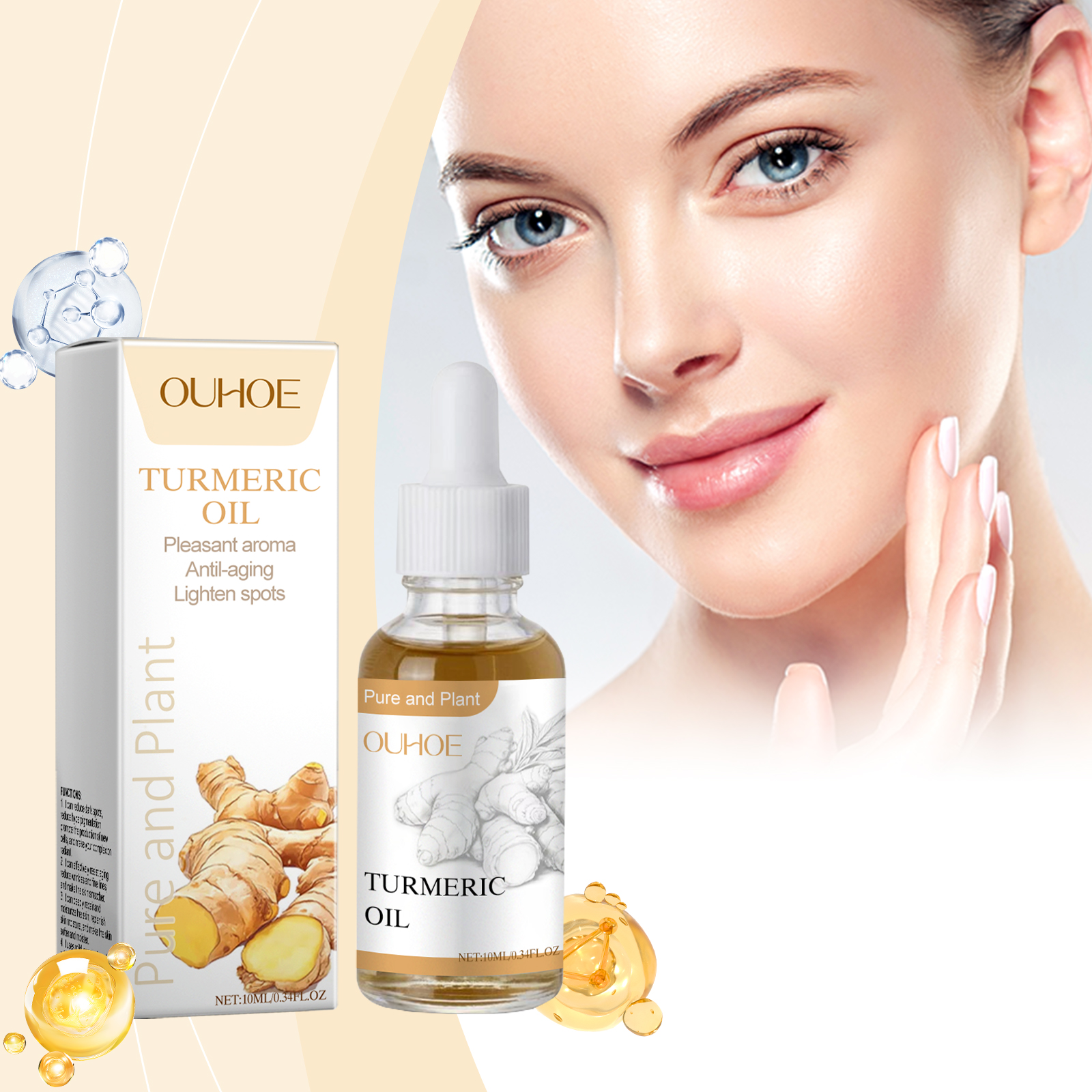 Our turmeric oil contains collagen and glycerin. It can improve the texture of the skin and make the skin more delicate and smooth. Its application is simple: clean your skin thoroughly and keep it dry. Apply appropriate amount of this product evenly on the face. Massage gently to promote absorption. And can effectively dilute melanin, even skin tone, restore skin luster.
