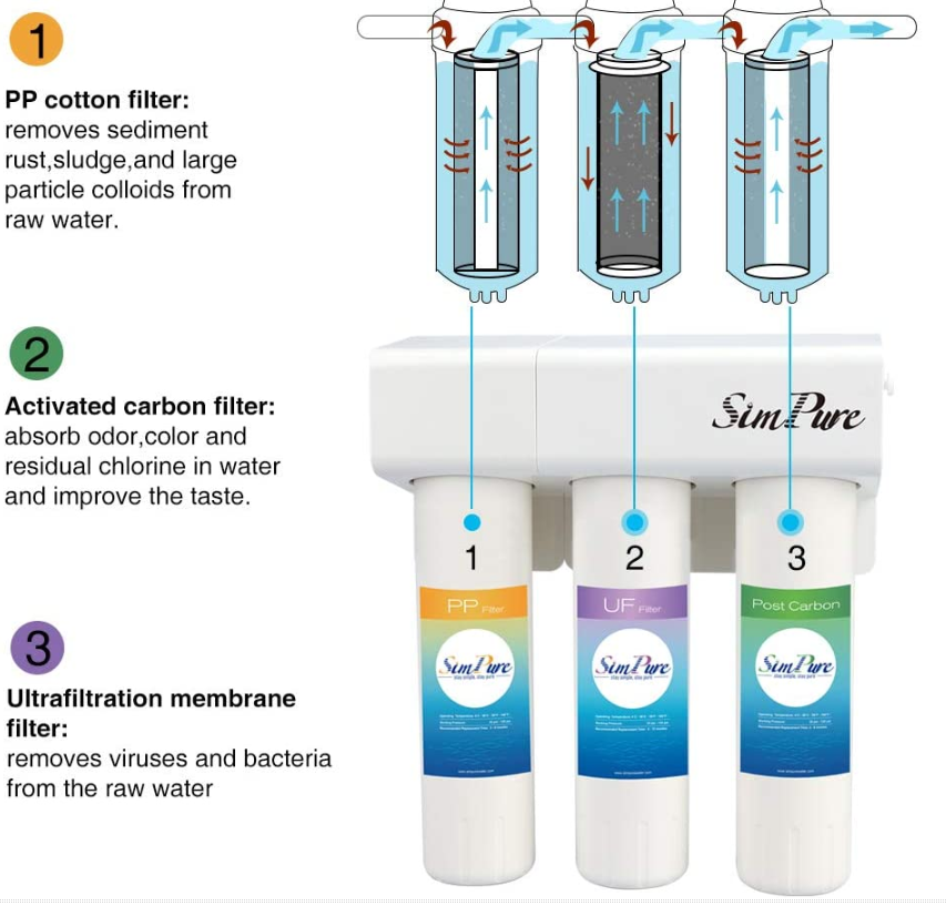 | UNMATCHED PERFORMANCE! The SimPure under sink water purifier reduces contaminants commonly found in tap water like chlorine, sediment, and radon; ensuring that you and your family get healthy and delicious drinking water always. Three in line filters are the perfect way to ensure maximum high filtration. |