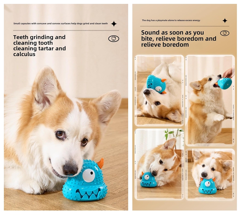 Unique design: This dog toy is presented in the form of a little monster, with exaggerated big eyes, cute little horns, and distinctive teeth. Its cute and interesting appearance can instantly capture the dog's curiosity and make it fall in love with this special "companion" at first sight.