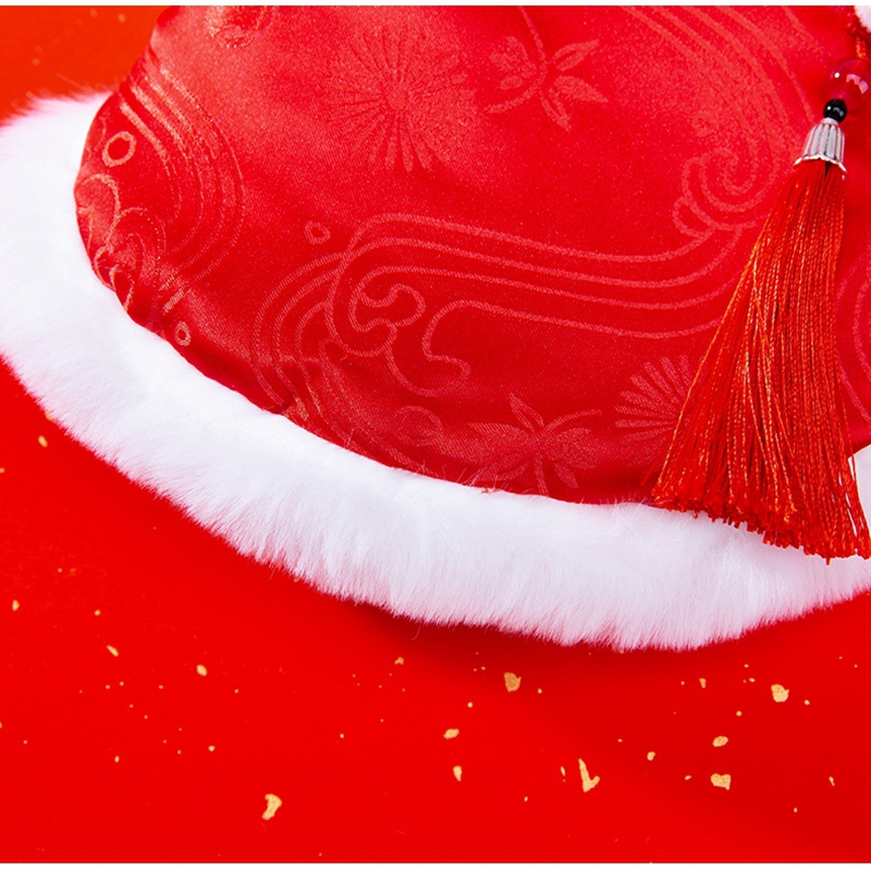 Crafted with glossy, textured red fabric (embellished with subtle floral patterns) and trimmed with soft white plush, it balances elegance and coziness. Key details include:
