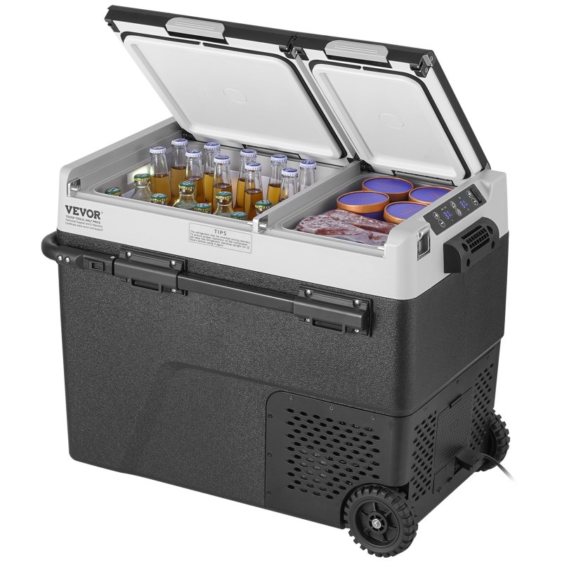 Large Capacity: The portable refrigerator freezer has a dual compartment capacity of 58 L / 61.5 qt. This robust RV fridge can hold 94 cans of 330ml cola or 34 bottles of 550ml water or 22 bottles of 750ml red wine, accommodating seafood, snacks, meats, and beverages, meeting the needs of long trips such as travel, boating, and camping.