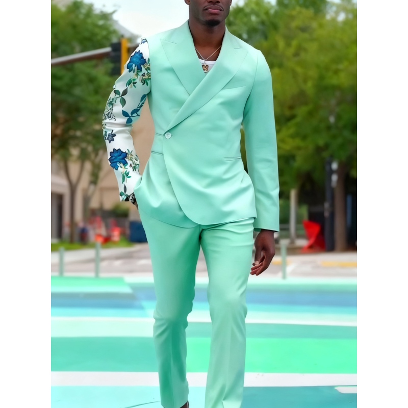 Mint Green Suit With Floral Print Sleeve And Double-Breasted Design