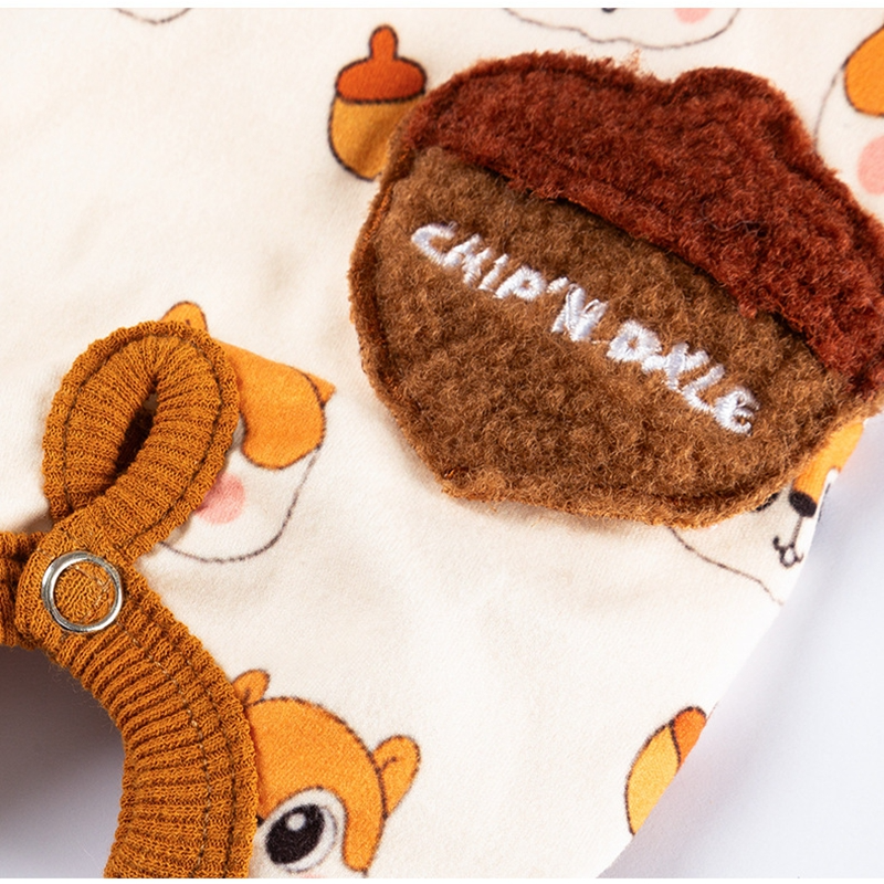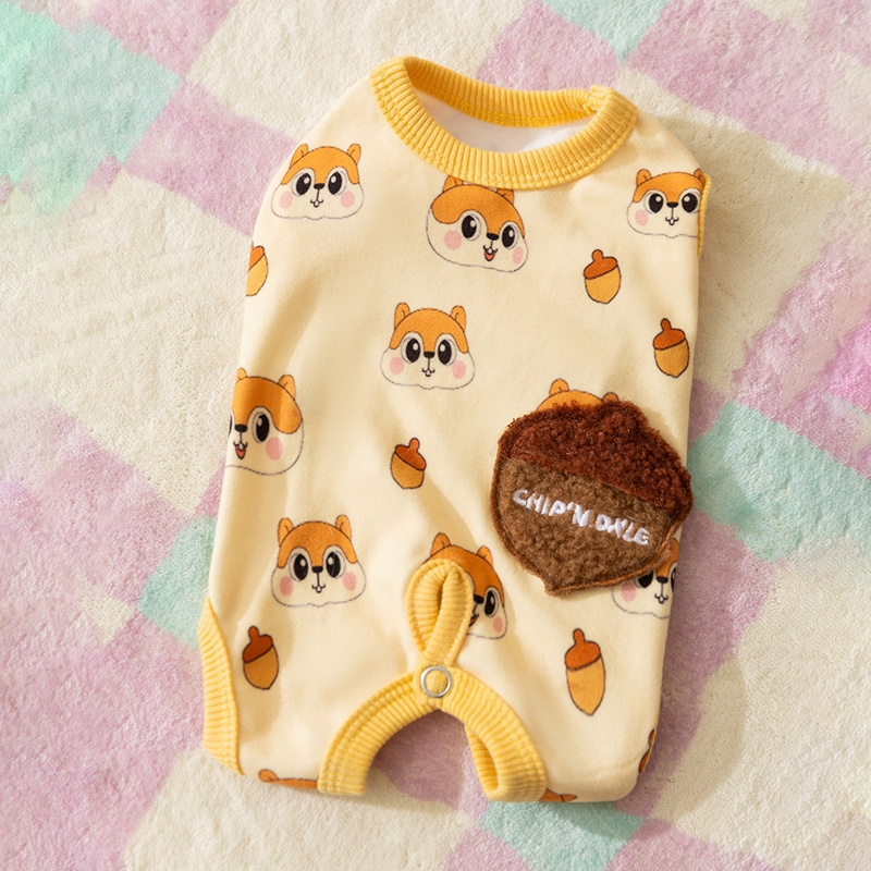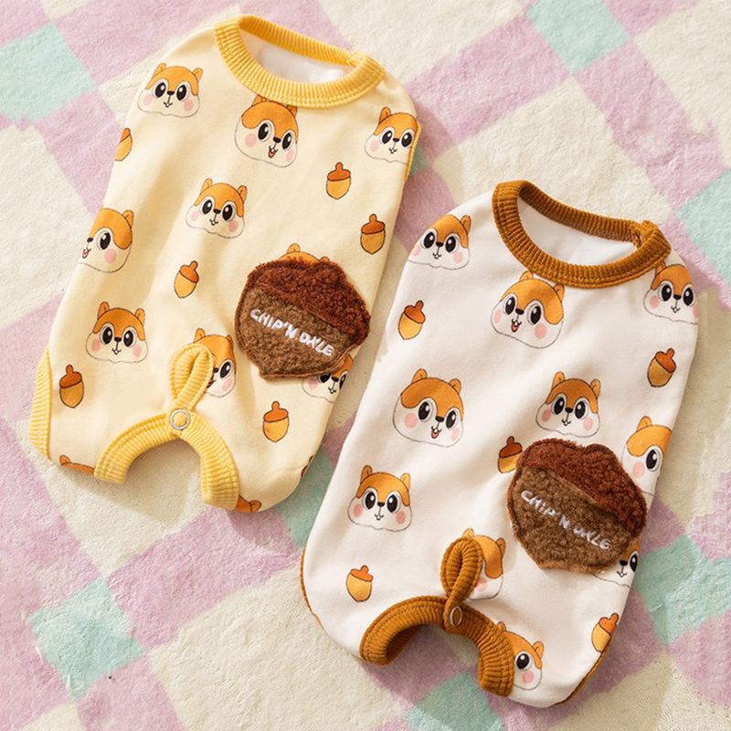 Bring endless cuteness to your pet's wardrobe with this Chip 'n' Dale Themed Pet Onesie! Featuring adorable squirrel and acorn prints, this jumpsuit is a must-have for fans of the beloved duo. Available in two charming color schemes—cream with yellow trim and white with brown trim—each onesie is designed with a soft, cozy fabric to keep your small dog comfortable all day.