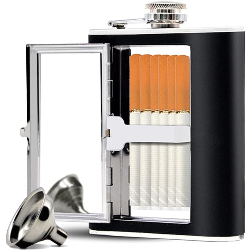 TWO IN ONE DESIGN: The hip flask can hold 6oz of your favorite liquor and has a compartment as built-in case for 6 cigarettes, mints or chewing gums. Its slim contour shape makes it easy to fit or hide discreetly in pocket, fishing box, beach bag or travel bag and an best idea for traveling, concerts and outdoor sports, like fishing, boating, hunting, ski, golf tours, camping, hiking, etc.