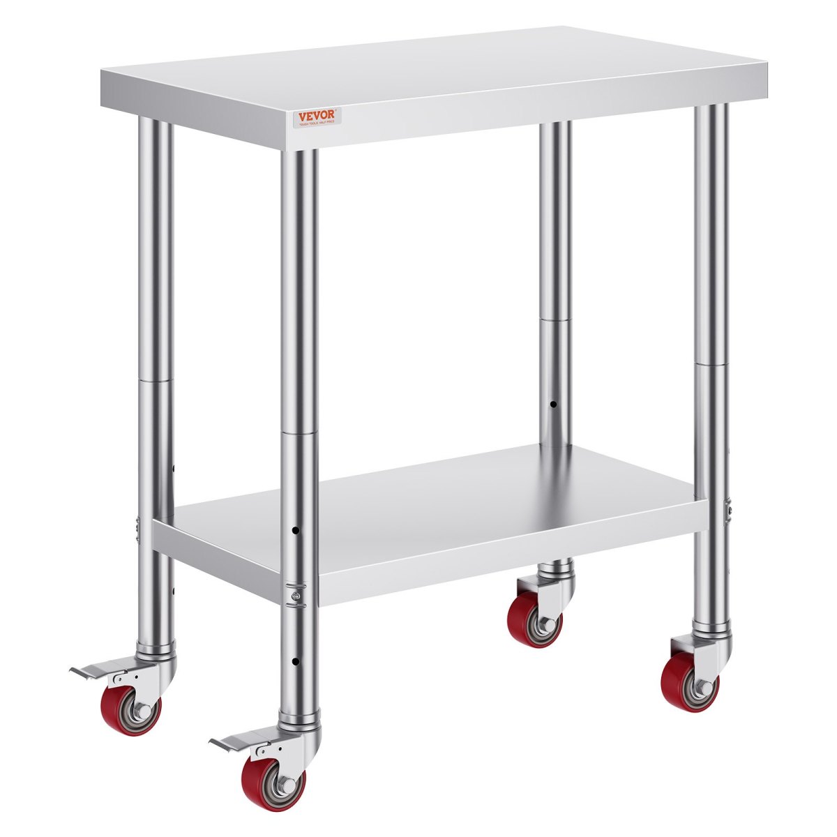 High-Quality Stainless Steel: This work table, measuring 30 x 18 x 34 inch, is made from SUS201 stainless steel for the tabletop, shelves, and legs. It offers superior rust resistance, a sleek appearance, and a smooth surface that is easy to clean with a simple wipe. NSF certified, it meets strict public health standards, ensuring long-lasting protection for your health. Stable and Durable: With an upgraded thickness of 0.8mm, this table is sturdy and durable. The upper shelf supports up to 400 lbs, while the lower shelf supports up to 300 lbs, providing ample storage for your supplies and allowing you to stack your favorite ingredients easily. Equipped with 4 swivel casters, including 2 with brakes, the table remains stable and can be easily moved to any location. Adjustable Height Design: The 3-level adjustable shelves offer the most user-friendly and practical features. Simply adjust the shelf height with screws to accommodate items of different sizes. Versatile Applications: Beyond storage, our table can be used for chopping vegetables, kneading dough, cutting meat, and other kitchen-related tasks. It is perfect for use in bars, restaurants, hotels, buffets, catering events, school activities, or office break rooms. Practical Sizes: Available in various sizes to perfectly fit your kitchen needs. Whether for commercial kitchens, home renovations, or your garage setup, our professional-grade stainless steel work table series is designed for lasting performance and reliability. We recommend measuring your space before purchasing.