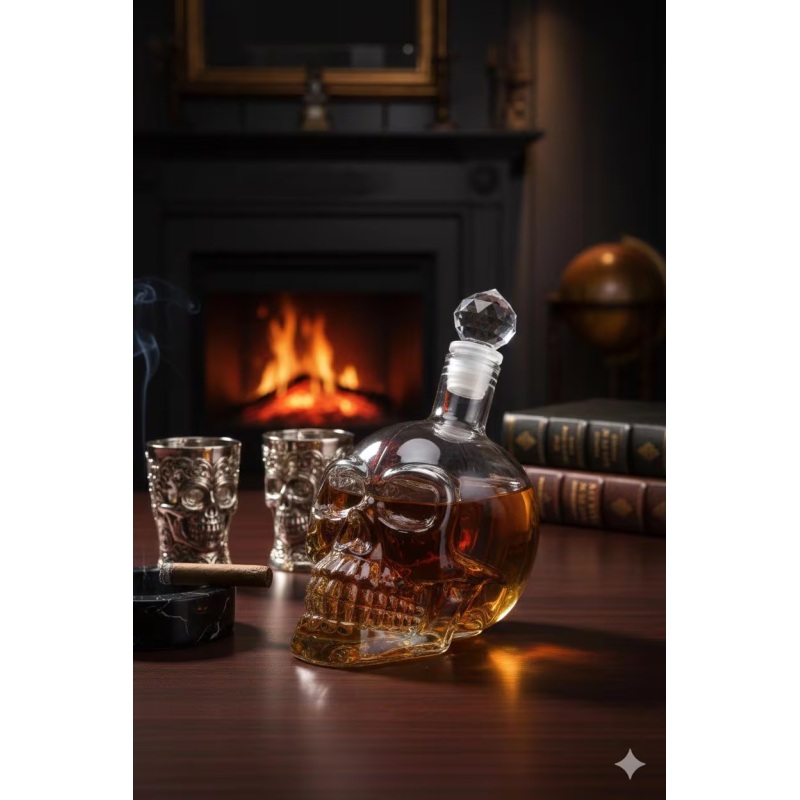 The Crystal Skull Glass Bottle offers a striking presentation for serving beverages.
