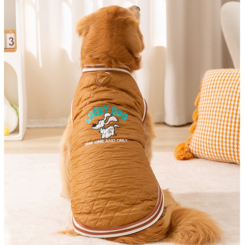 Keep your large dog cozy and stylish with this "Lucky Dog" Quilted Pet Vest! Designed for big breeds like Golden Retrievers, this brown quilted jacket features a playful "Lucky Dog" cartoon embroidery, the slogan "THE ONE AND ONLY," and an integrated leash ring. The quilted construction ensures warmth during cooler days, while the relaxed fit allows full mobility. Perfect for winter walks, indoor lounging, or casual outings, this vest combines functional warmth, fun design, and a tailored fit for large furry companions, making it a must-have for pet parents who want their big dogs to stay snug and fashion-forward.