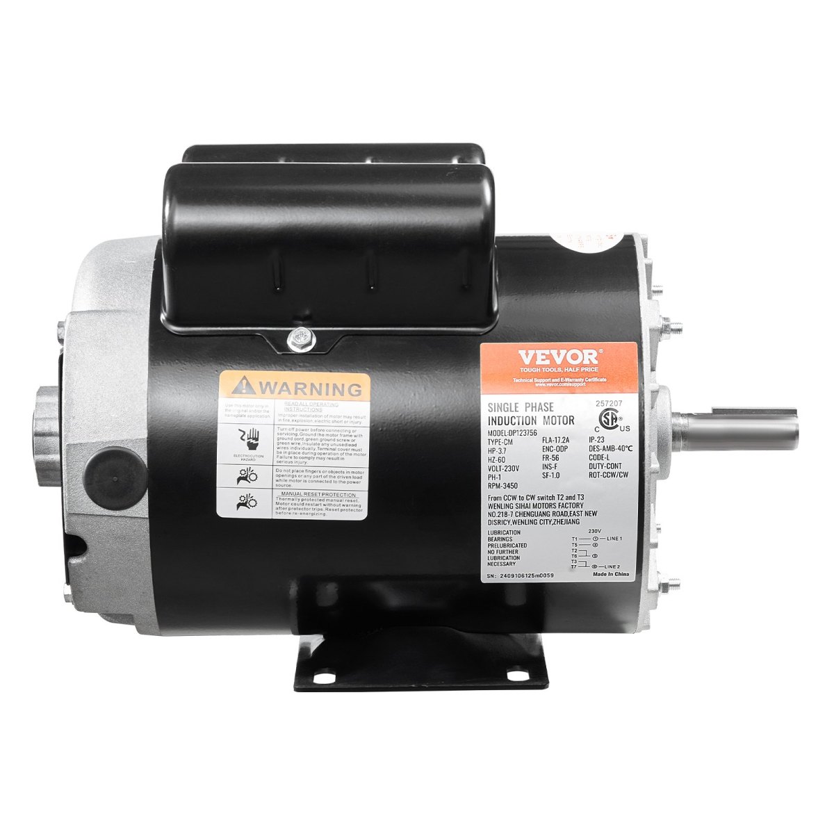 High Performance: 3.7HP 3450 RPM, Single Phase, Full Load Amps: 17.2Amp, 230V 60Hz, SF: 1.0.