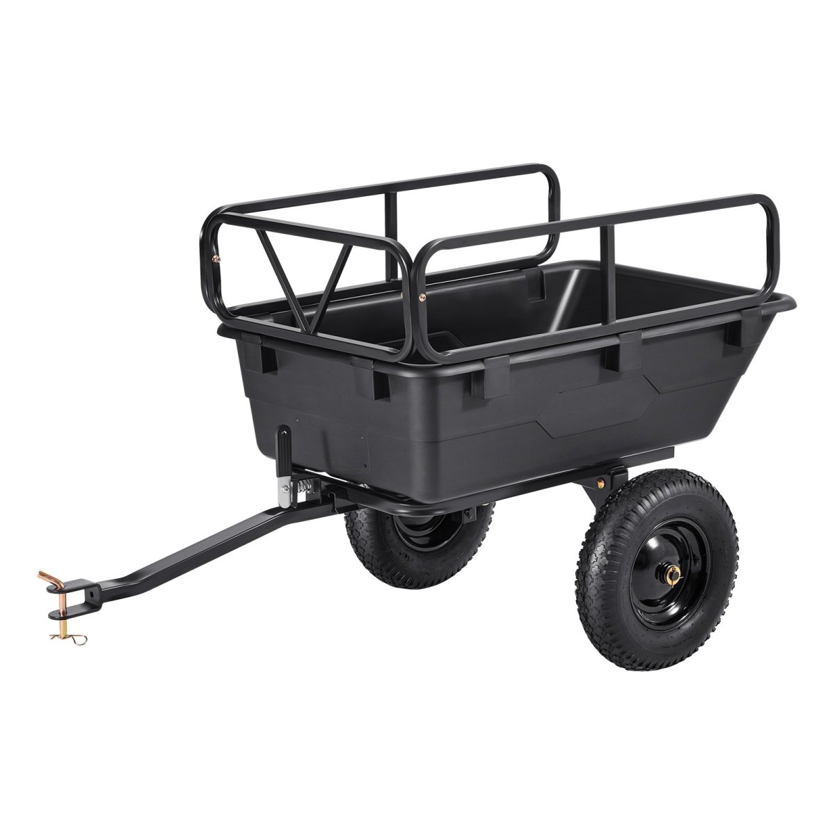 Durable and Sturdy: The yard trailer with seamless, molded PP hopper adds thickness and prevents rust and damage, ensuring long-term durability. It withstands exposure to sun and moisture, is easy to clean, and prevents dirt buildup, reducing maintenance concerns.