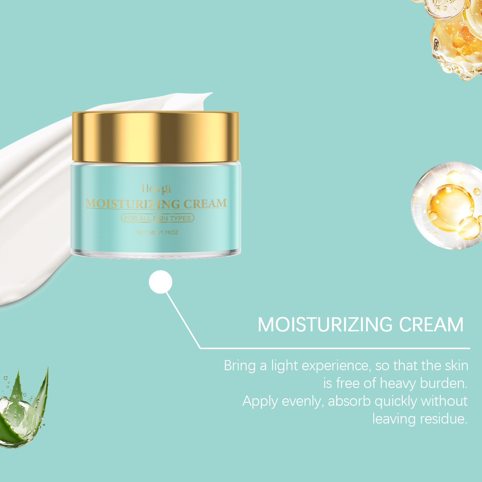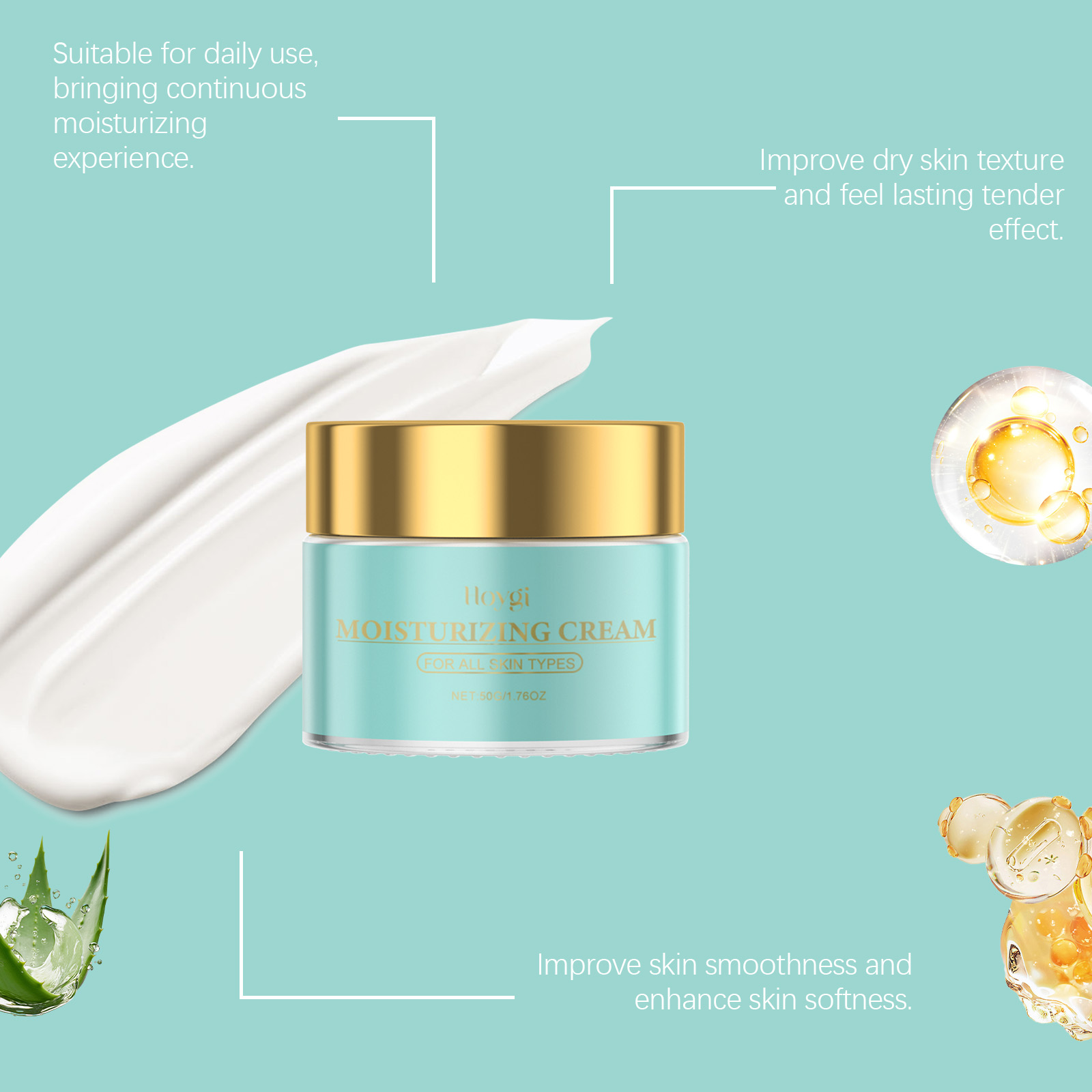 Our anti-aging facial moisturizer contains triethanolamine, aloe vera extract, Vitamin E (tocopherol). It keeps the skin fresh and breathing. The way to use it is simple: clean your face and keep it dry. Apply appropriate amount to face evenly. Massage gently until absorbed. And can moisturize the skin, absorb quickly, leaving a smooth protective film.