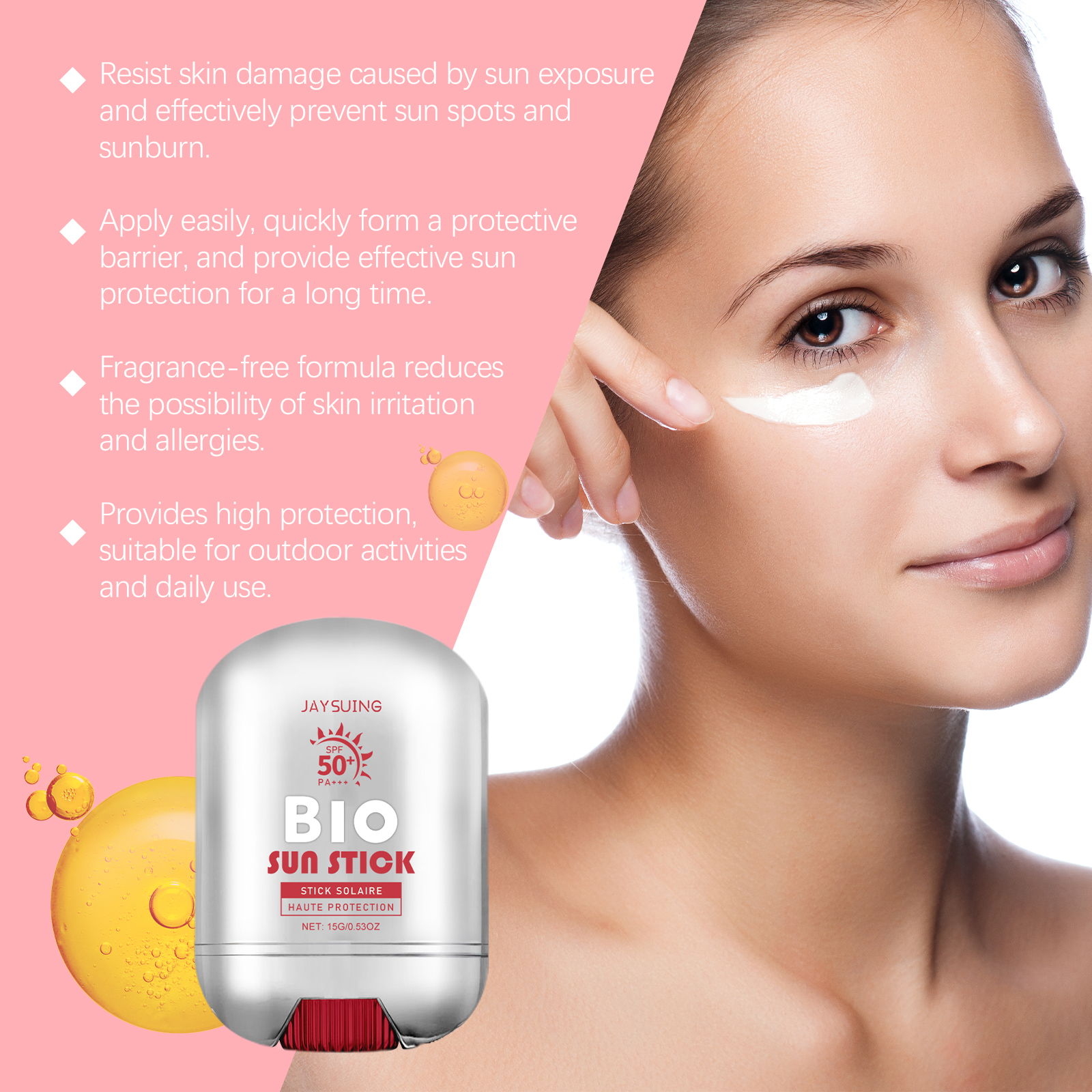 Our protective rod isolation contains glycerin, titanium dioxide, hydrolyzed collagen. It can effectively block ultraviolet and UVB rays, and fully protect the skin from UV damage. Contains mild moisturizing ingredients, immediately after use skin feel hydrated and comfortable. Its application method is simple: 1. Thoroughly clean and dry the skin; 2. Turn the bottom plate and apply the sunscreen stick to your face. 3. Gently massage with your hands to help better absorption. Specially formulated to maintain long-lasting sun protection even in water or after sweating.