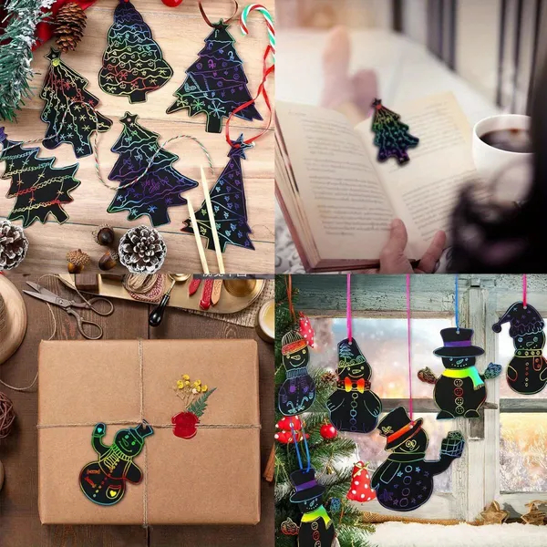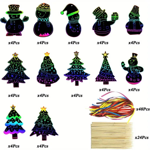 Specifications Material: Paper Size: scratch papers: 104*13cm/4.1*5.12inch; ribbons: 70cm/27.6inch; bamboo pens:14cm/5.5inch Package contents: 48pcs Christmas scratch papers + 48pcs ribbons + 24pcs bamboo pens Note: Due to manual measurement, there will be a slight error in the size. Due to the light and screen difference, the item's color may be slightly different from the pictures. Please understand.