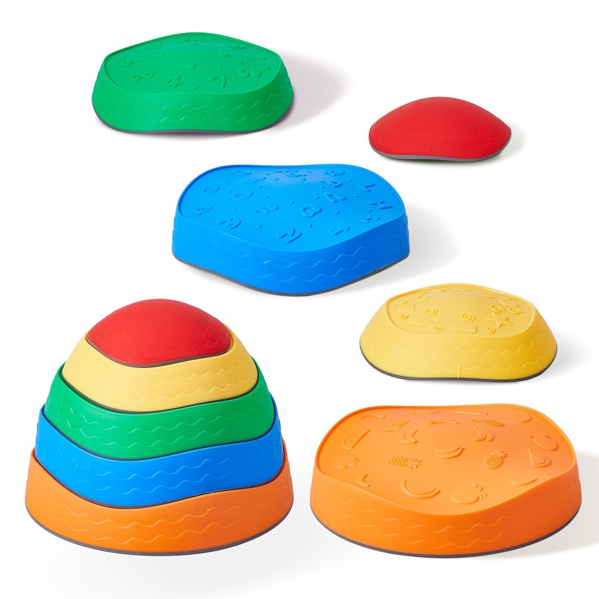 Features & Details 5-Piece Sensory Toy Set: Balance stepping stones with playful geometric designs and vibrant colors captivate kids' attention and spark their curiosity. Beyond basic balance training, mix and match with other toys for endless play options, boosting kids' skills while keeping the fun fresh. Comprehensive Non-Slip Design: Equipped with non-slip silicone bases and textured tops, plus non-slip socks, these stepping stones for kids provide triple protection against slips. Parents, relax! Your little ones can enjoy every step with confidence. Safe and Sturdy: Crafted from health-friendly, innocuous PP, our toddler stepping stones are safe, easy to clean, and built to last. With a solid 4mm thickness, they can handle up to 220 lbs, making them perfect for long-term play by kids of all ages. Easy Storage: Designed for easy stacking, these sensory stepping stones for kids save space and simplify storage and organization. Whether at home or in the kindergarten, tidy up in a breeze and keep your play area clutter-free. Play Anywhere, Anytime: Lightweight and portable, with a handy storage bag, these balance stones transform any space—from cozy indoor carpets to lush outdoor lawns, even parks and beaches—into a playground paradise. Let the adventures begin!
