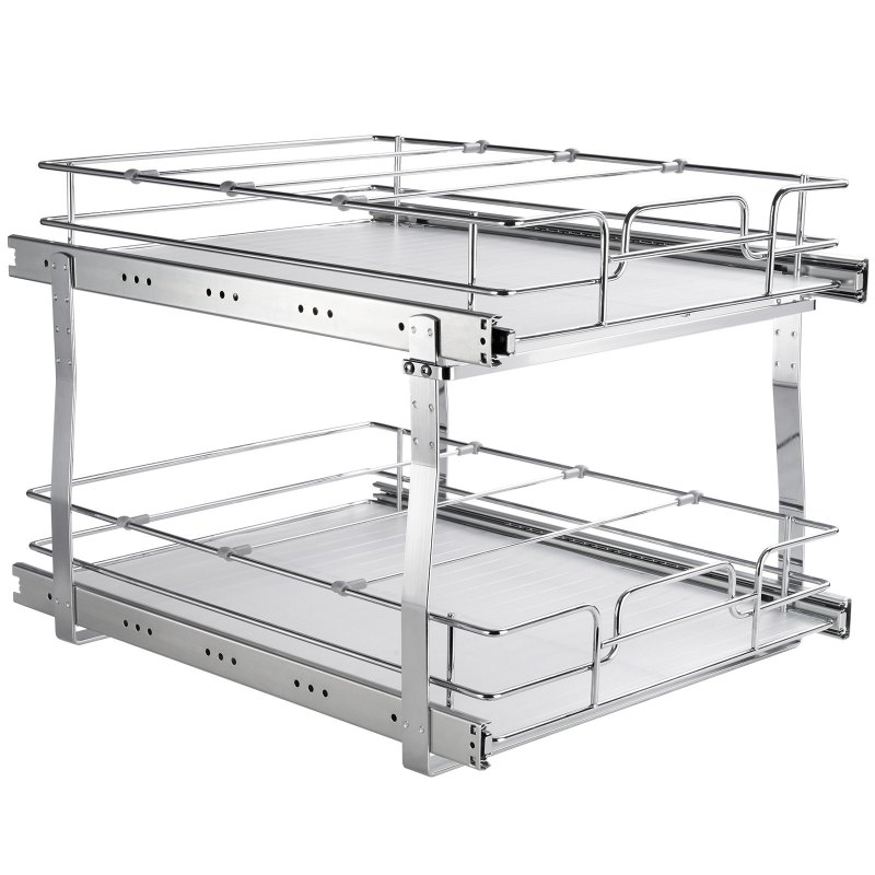 Smooth and Quiet Sliding: Using an industrial-grade ball sliding system, even under the weight of heavy portable equipment (such as kitchen mixers, pots and pans, and other kitchen utensils), this 2-tier wire basket slide shelf can slide smoothly without unpleasant noise.