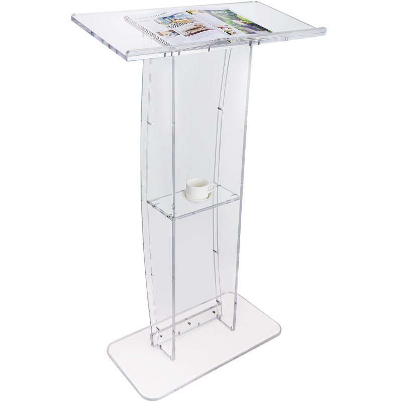 Features & Details Chic & Sleek Podium Stand: Elevate your presentations with the VEVOR acrylic podium! Standing tall at 47 inches, it provides excellent posture support, making it perfect for a wide range of public speaking venues such as churches, weddings, seminars, schools, and more. Crystal Clear Acrylic: The acrylic pulpit boasts an incredible 95% luminosity, making it crystal clear and able to complement any style or decor. You can enhance the podium's elegance even further by decorating it with flowers, logos, crafts, or pictures, ensuring that it turns heads and captures attention Craft for Perfection: Experience the ultimate combination of durability and elegance with the acrylic podium stand. It's crafted from thickened acrylic board and designed to support up to 66 lbs without any wobbling, making it the perfect choice for all your speaking needs. User-friendly Desktop Design: The spacious desktop of the pulpit accommodates your laptop, notebook, and more. Its tilt angle protects your cervical spine, while the stopper prevents papers from slipping down. There's also a pencil slot at the top for easy access to writing utensils. Win in the Details: The clear pulpit podium comes with an additional storage shelf to help you keep your coffee, drinks, water cups, and other meeting materials organized. Furthermore, the bottom of the podium is polished, making it smooth and gentle on your floors.