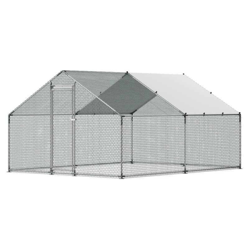 Spacious Living Area: Offering a generous 9.8x13.1x6.5 ft of space, this metal chicken run features four-sided ventilation, creating a healthy and comfortable environment. The PE-coated canopy provides sun protection, waterproofing, and tear resistance, shielding your poultry from external elements.