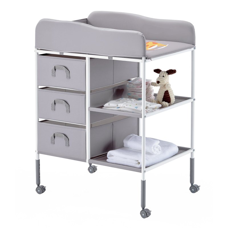 Portable Design: With 4 lockable and silent swivel wheels, this baby changing table is easy to move around without damaging your wooden floors. The raised edges on all four sides create 360° security protection, keeping your baby in a secure environment