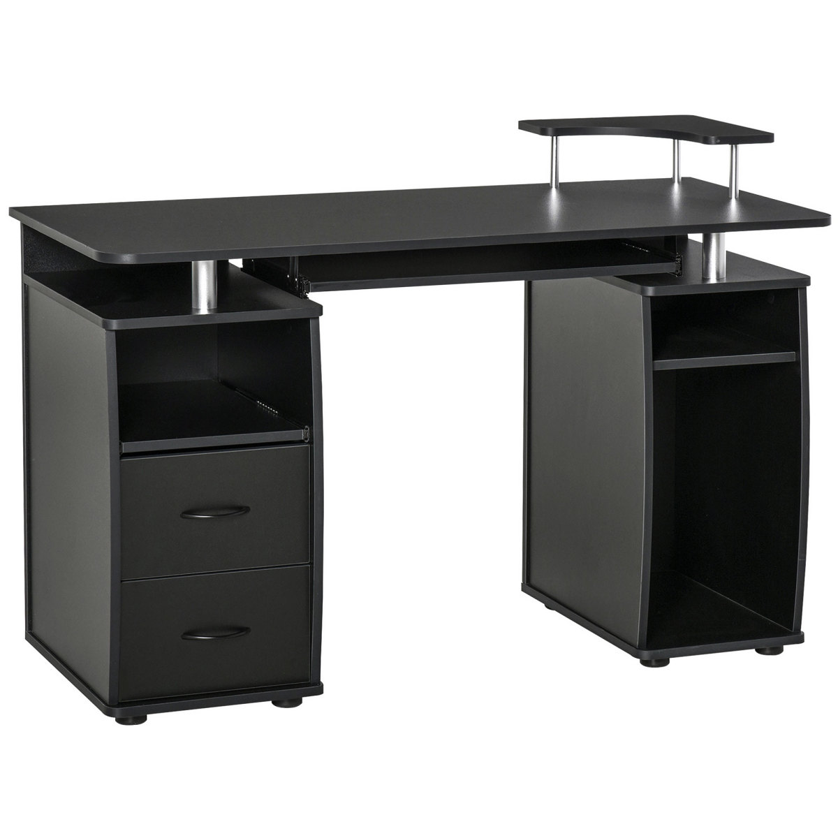 For when an ordinary desk just won't do, then bring this number into the equation. Blending the beautiful with the functional, this piece is made to stand in all different spaces - the bedroom, study, attic and beyond. It features a large tabletop, elevated monitor shelf and keyboard tray, giving you room to keep everything organised and room to work. There's a computer tower holder on the lower right and a two-drawer cabinet on the left, giving you even more room to keep everything together. It's finished with metal handles and feet on the bottom for balance and floor protection.