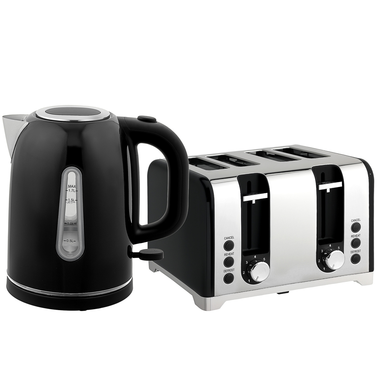 Sleek style for the countertop, with this toaster and kettle set. In black, with polished metal accents - a simple design which complements your current small appliances. The LED strip glows for a touch of ambience when working. The 1.7L kettle capacity boils enough for seven cups; with an Otter thermostat to deliver fast and precise boiling with safety features. And thanks to the seven browning levels on the four-slice toaster, it's easy to enjoy your food your way.