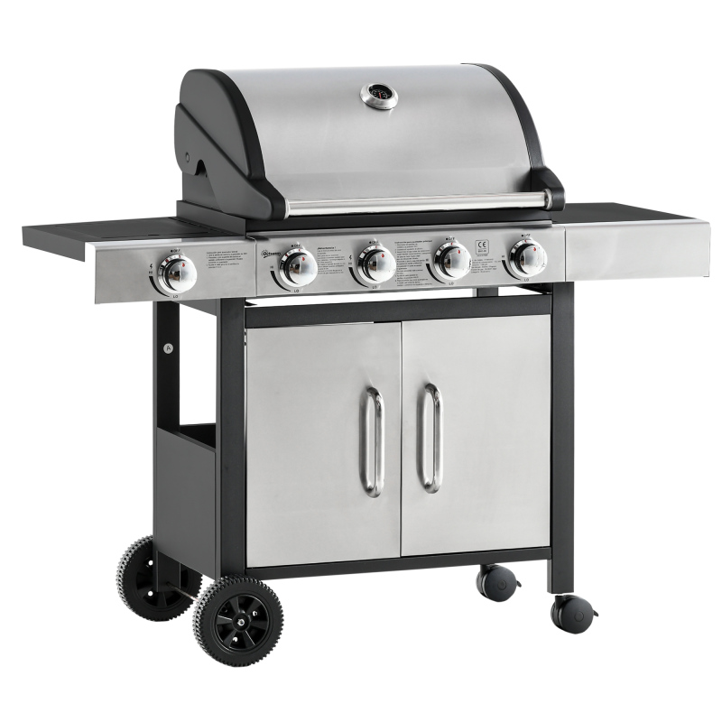 Leave eyes and mouths envious with this super-sleek BBQ grill from . This multi-feature outdoor and garden piece is formed of the main enamel BBQ grill with upper warming rack, a side gas burner, cupboard and shelf on each side. Our BBQ smoker is made from a blend of stainless steel and metal for a tough shell, with cool-touch handles to prevent burns. A thermometer fitted on the lid means you can control the temperature better, it's finished with two wheels to move easily.