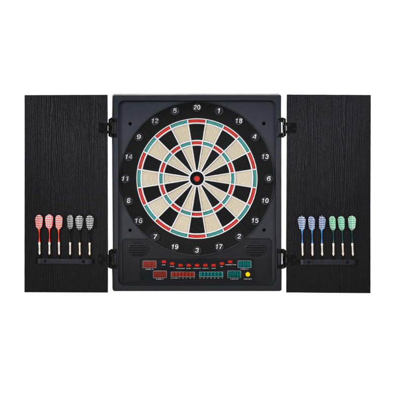 Bring classic game fun to the home with this LED dartboard from . A luxe design which features a dartboard in a two door casing to protect the board when not in use. The inside of the doors hold the darts for safe keeping. A large catchment area allows any missed-spot darts to collect and avoid damaging any other areas. The LED panel on the bottom keeps track of the score so you don't lose track, with 27 games and 202 different scoring options. Volume is adjustable.