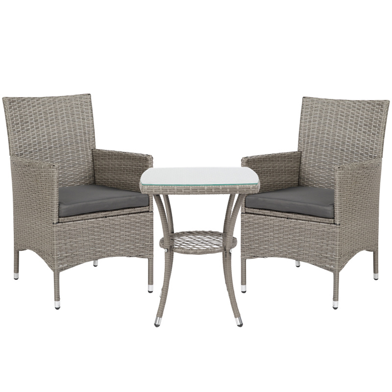 This outdoor bistro set is great for any patio, garden, porch and similar spaces. Frames of the rattan bistro set is made from powder coated steel mean a strong structure, wrapped in plastic PE rattan wicker for garden rattan style. UV and water resistant. Matching table gives a handy side surface, with a safe and sleek glass top. Repeat and use, season after season.
