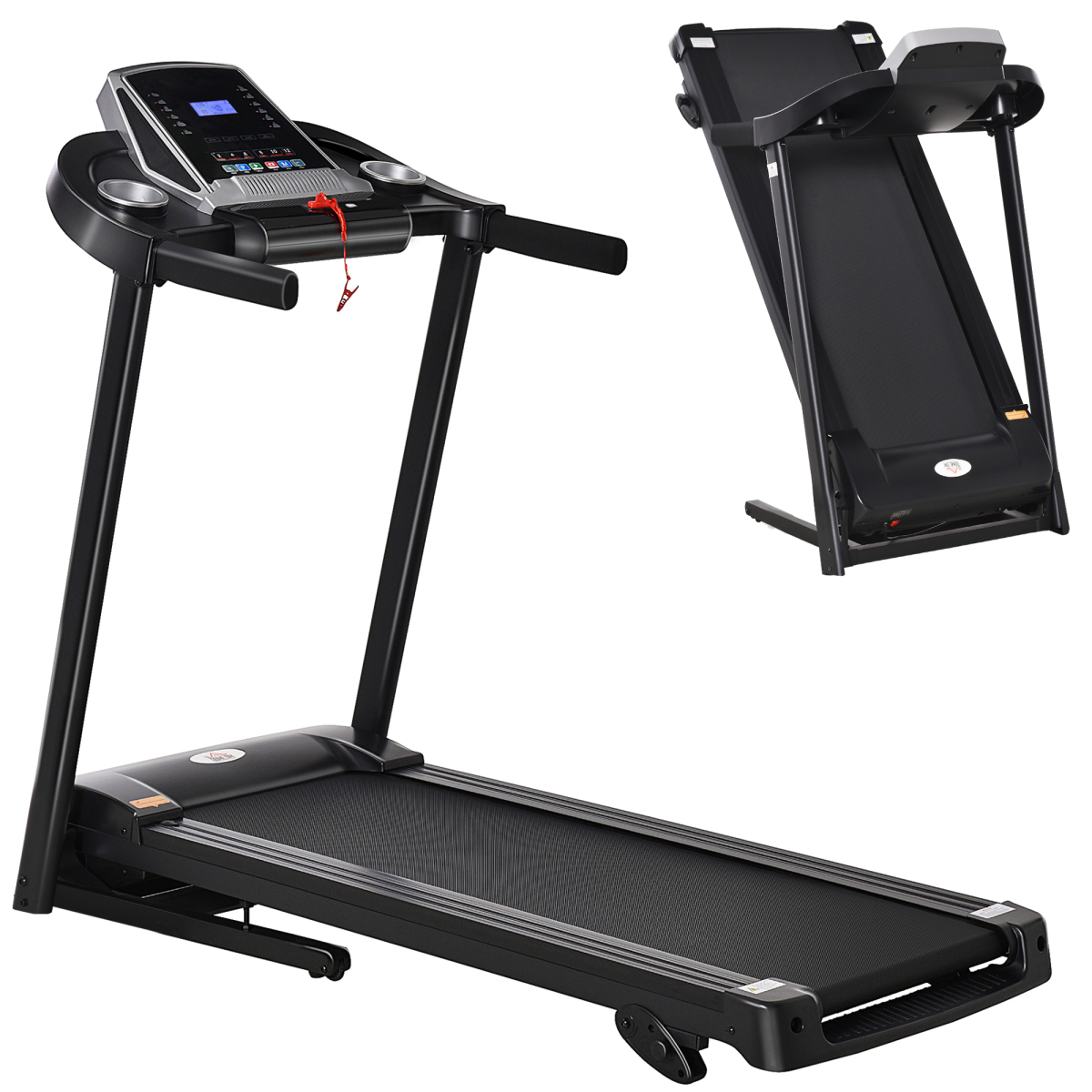 Want to stay active at home, without leaving the door? Then get this foldable treadmill from . The walking treadmill goes up to 12 km/h, giving you plenty of speed for a solid workout, with 12 modes to switch up your routine. The running mat angle can be positioned to three different angles. LED screen shows time, speed, distance – easy to keep track of your progress. Safety key stops walking machine immediately when pulled out. The compact treadmill completed with two wheels on the base.