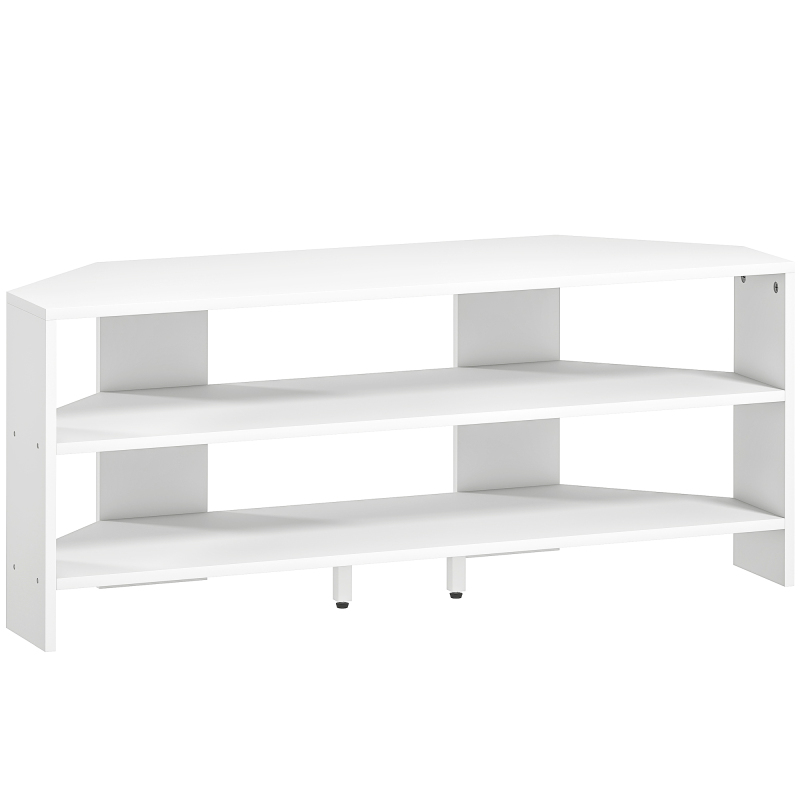 Transform your cosy corner into the optimal chill-out zone with the TV stand. Its clever corner design maximizes space while the two open shelves and flat top keep your media essentials organised. Made for up to 47" screens, this TV table stand blends functionality with a sleek, minimalist style that ups the ante of any room's ambiance. No more awkward gaps—just smart, stylish storage for your TV and gear!