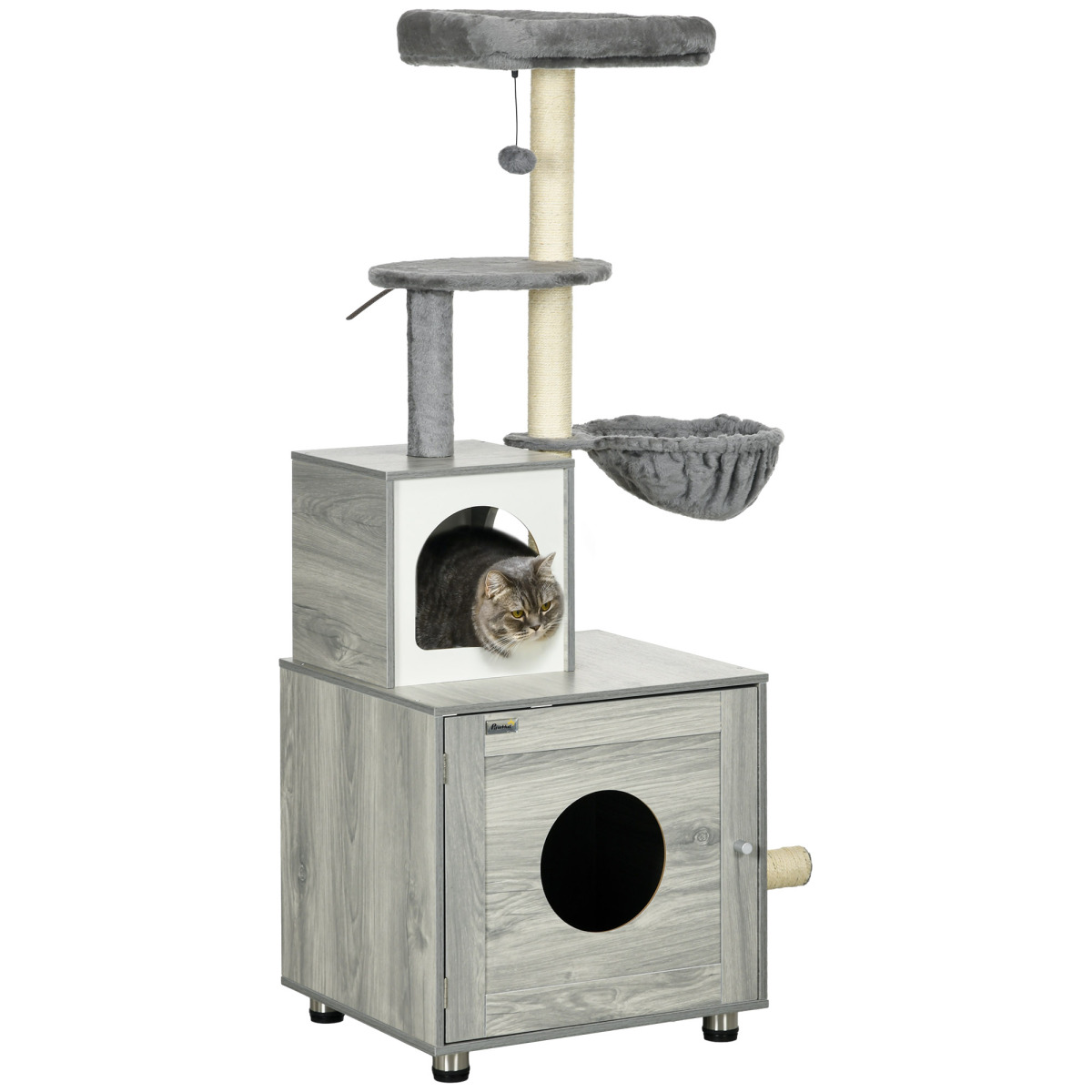 Discover pet paradise with this PawHut cat tree, which also has a litter box. The ultimate haven with different levels for climbing and jumping, whilst the hanging toy ball grabs their attention when feeling playful. Instead of ruining your furniture, they'll dig and shed their claws on the scratching posts. To use the toilet, the enclosed litter box gives them a private space to do so. Then, they'll relax in their comfy hammock or top perch, covered in soft plush for extra cosiness.