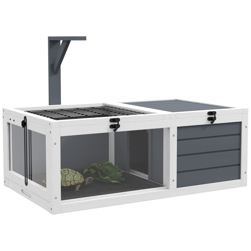 Introducing the PawHut two-room tortoise house – a wonderful habitat for reptiles. With a roomy living space and an expansive run area, it's great for roaming and basking. Achieve the right temperature with the wooden lamp holder. Cleaning is a breeze, thanks to the double pull-out tray and openable lids, simplifying pet care. Elevate your pet's lifestyle with this delightful home, designed to foster their well-being, allowing them to thrive.