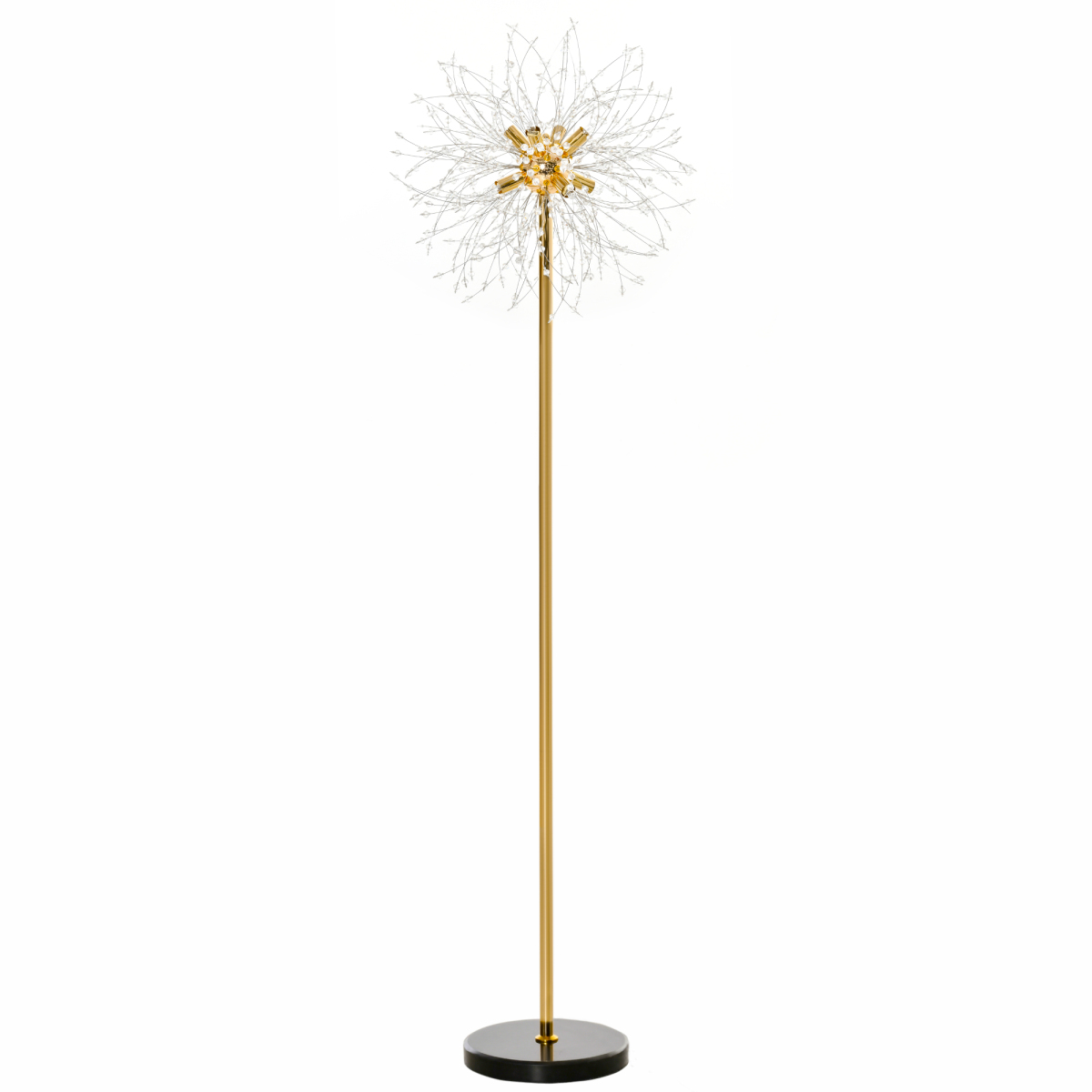 Elegant home decoration with this floor lamp. A dandelion flower design, where all strands are fitted with crystallite beads - catches the light and sparkles. A metal frame for a strong core, finished in a gold tone for extra elegance. Complete with a foot switch to turn on/off, and a marble base to keep weighted.