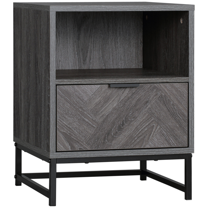 Need some more storage in your bedroom or other living areas? This end table is here to help. The dark grey colour with black steel frame puts a new spin on the Industrial-style trend; looks great. The drawer and open shelf offer plenty of storage room. Use it as a night table beside your bed or just as an end table in the living room. Steel base offers plenty of support.