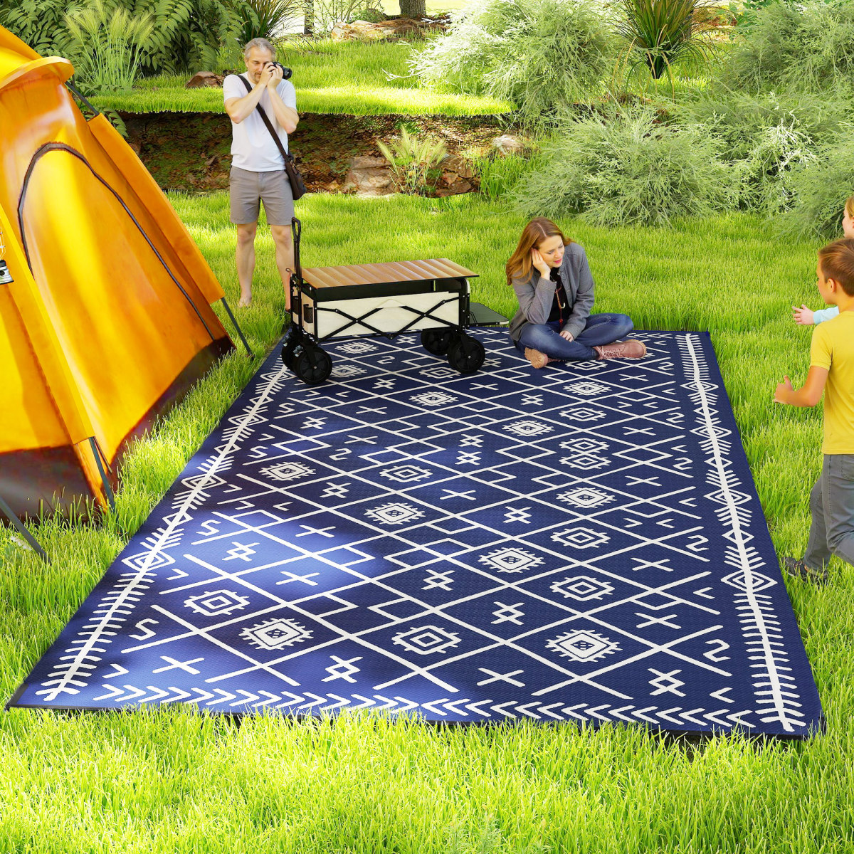 Reversible Outdoor Rug, Waterproof Plastic Straw with Carry Bag, 9' x 18', Blue & White Rhombus