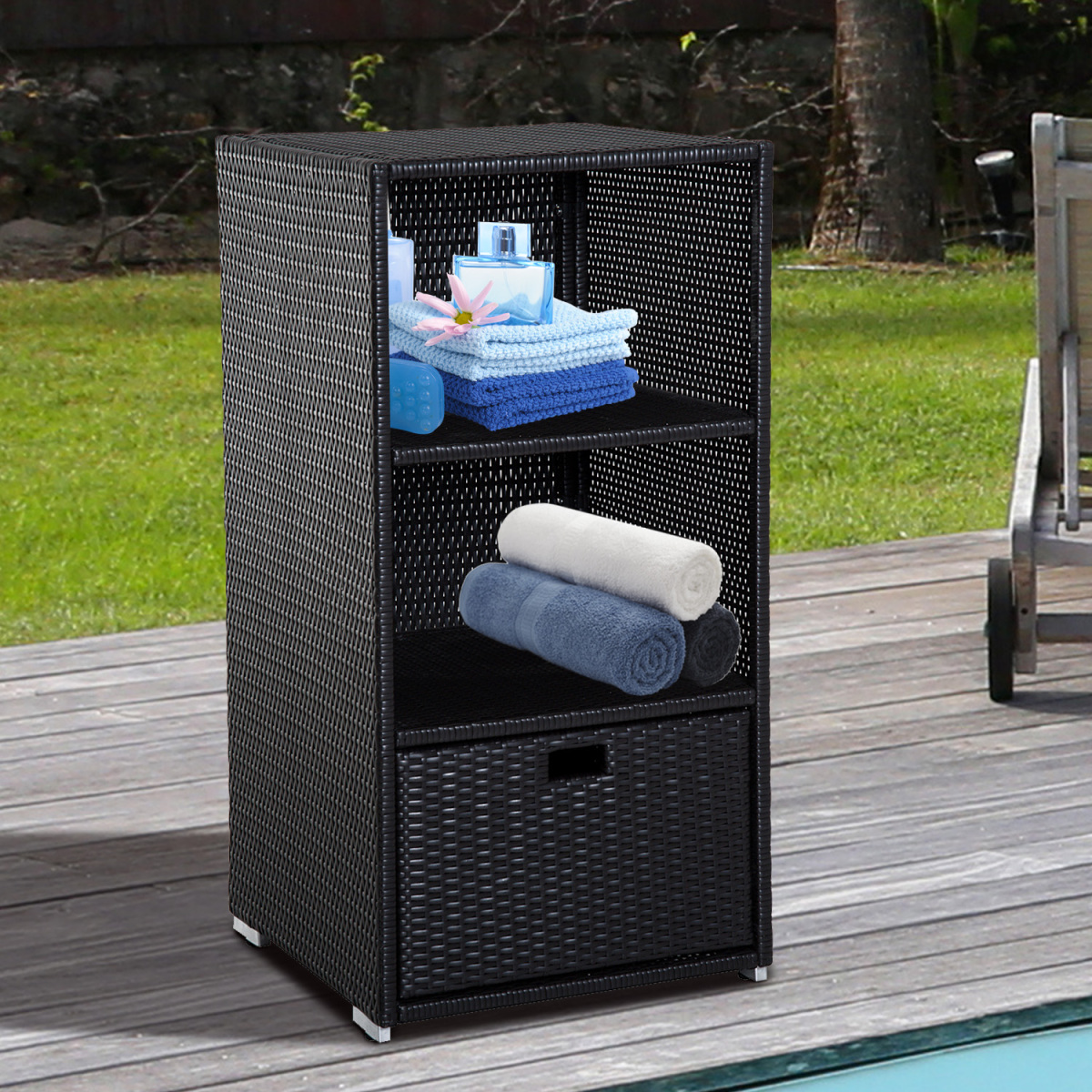 Keep your towels and pool accessories always close by with the convenient [BRAND NAME] 47'Rattan Wicker Outdoor Pool Towel Valet Stand. Constructed from durable aluminum and all-weather PE rattan wicker this handy towel storage cabinet features 2 upper shelves and a large bottom drawer for additional storage options. Add one to your pool or spa deck and impart the look and feel of a resort or private club to your own backyard!