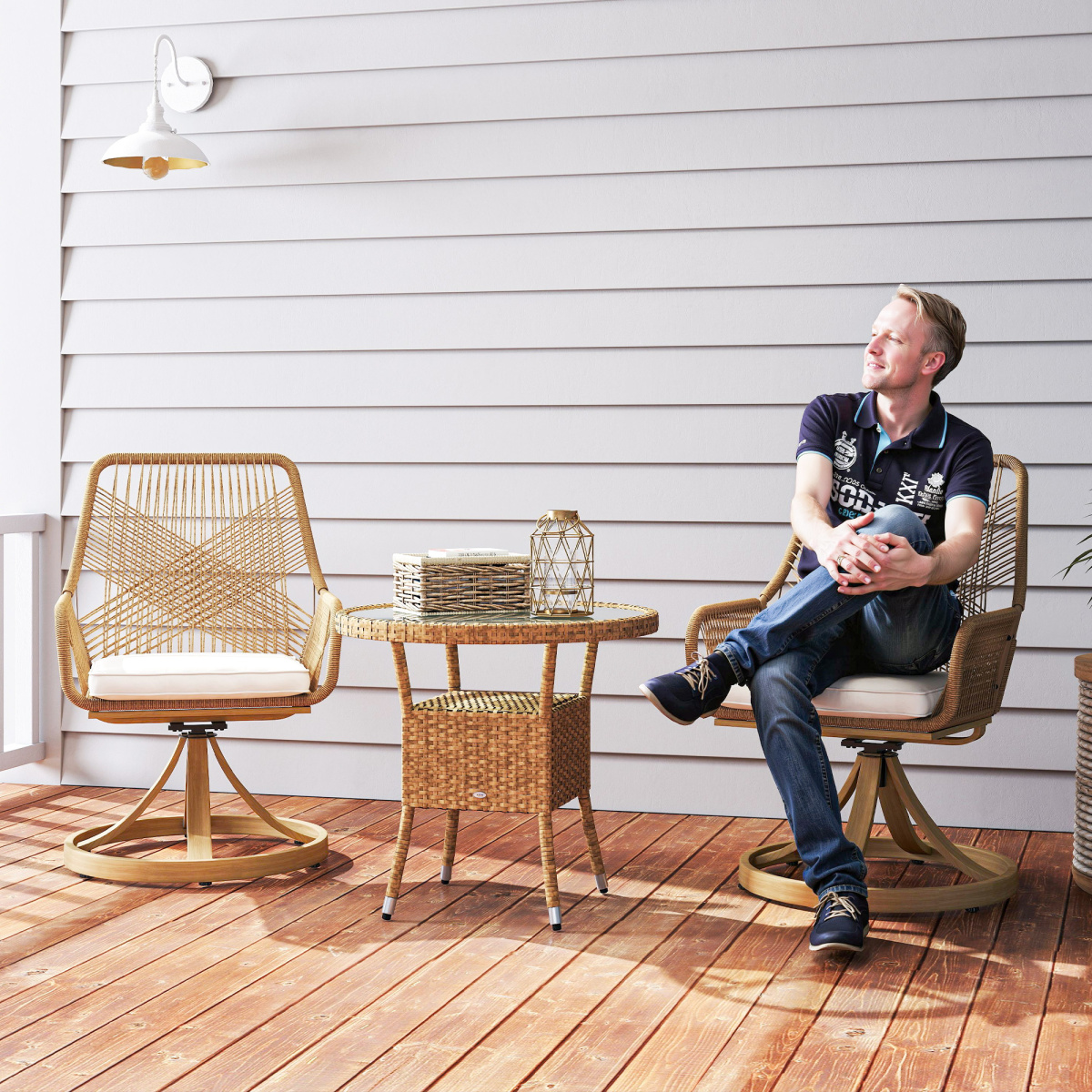 Relax in style with this two-chair set of [BRAND NAME] swivel patio chairs! Designed for superior comfort, these rattan chairs feature a smooth 360° swivel motion for easy rotation and positioning. Suitable for patios, gardens, or balconies, the weather-resistant rattan weave is built to last and adds a touch of elegance to any backyard setting. Whether you're chatting, reading, or soaking up the sun, this wicker swivel chair set brings out the best in your outdoor relaxation time!