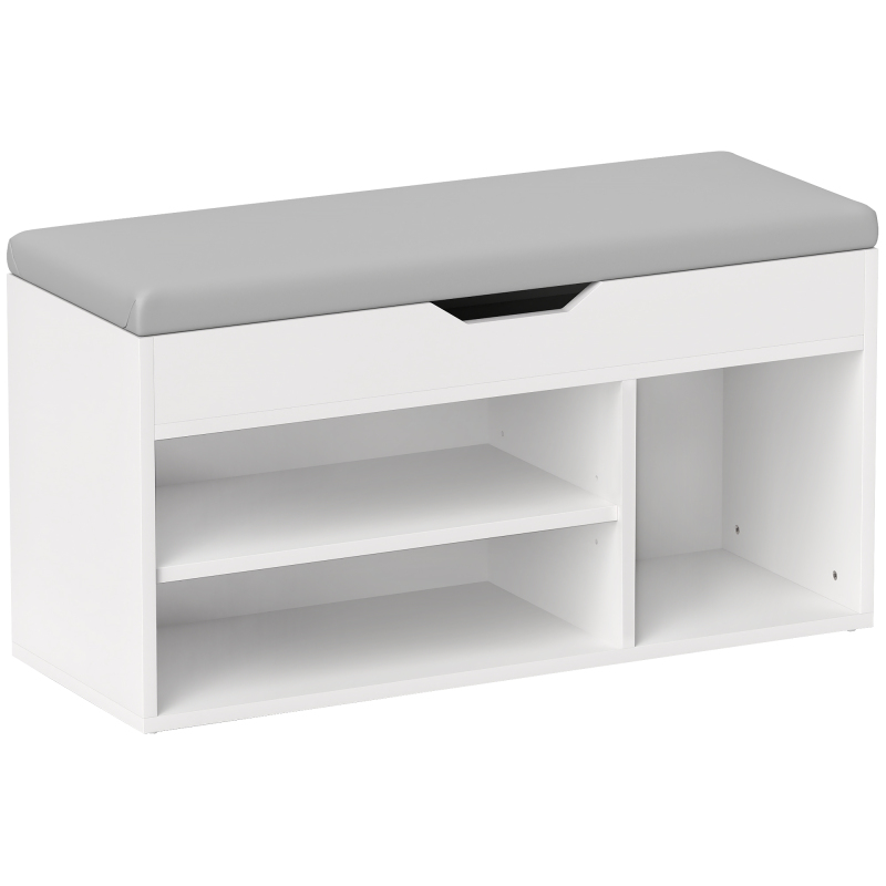 This stylish shoe storage unit from is excellent for all homes. It is crafted from engineered wood for a strong and stable structure, in a cream white finish for beauty. It features three open compartments: spacious in size for keeping your shoes, with a concealed spot on the top for keeping other bits stored. Thick cushion sits on top, keeping you comfortable as your sit, with side groove handles so you can move it around easily.