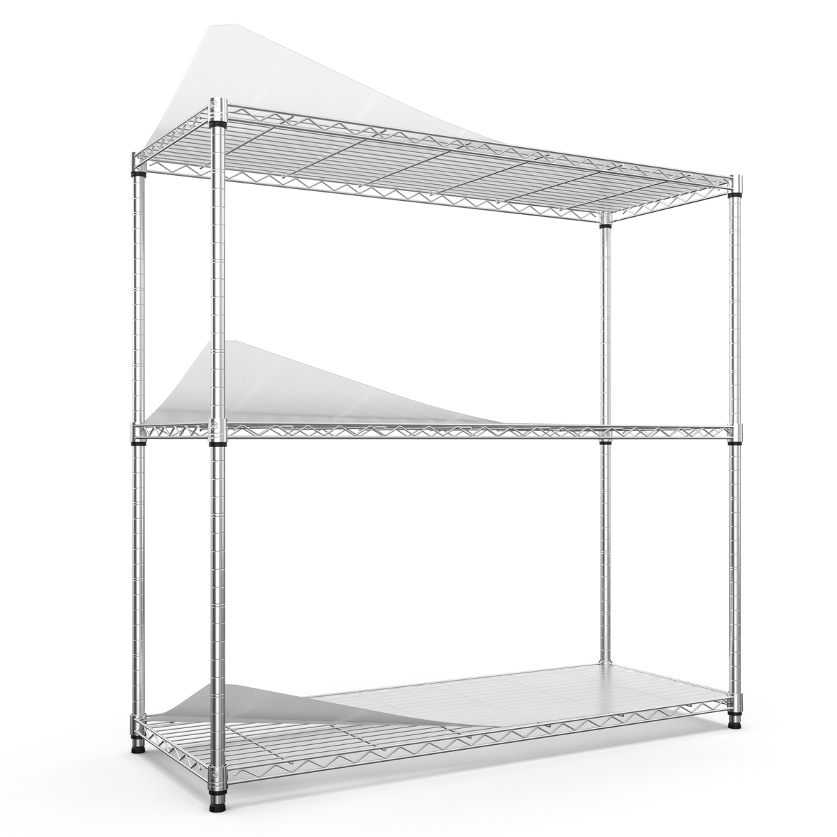 [3 TIER LARGE CAPACITY] - Heavy duty shelving with leveling feet - each layer shelf can hold 350lbs (evenly distributed), maximum load capacity is 1050 lbs. It is recommend that heavy items on the bottom shelf for maximum stability. 3 shelf Liners choice of beautiful and fun transparent colors allow you to add a pop of color to your life. Shelf Liners is waterproof - Won't get damaged from exposure to moisture.[ADJUSTABLE DESIG] - Each shelf can adjustable in 1-inch increments, adjust the shelf height according to size of the item, meet your different needs, get the best utility shelf.[EXTREMELY DURABLE] - Wire shelving made of heavy steel, it has excellent rust resistance and oxidation resistance. Our wire shelf liner is crafted to provide unparalleled quality, longevity, function and beauty. Better quality thicker than the competition. The 3 tier shelf unit passed NSF certified, safe and reliable. Storage rack are perfect addition to home, office.[EASY MOVEMENT] - 3 tier garage shelves have 4 leveling feet. Wire rack on leveling feet can be easily positioned in supermarkets, garages, closets, kitchens, porch, pantry, etc. Height-adjustable leveling feet can be placed on uneven ground- simply twist to stabilize. Non-slip, will not scratch ground.
