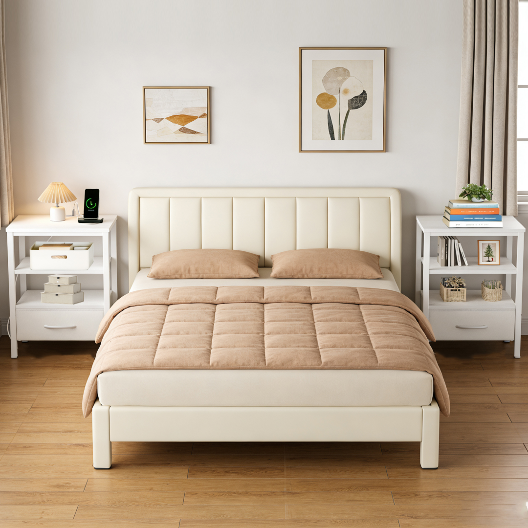This bedside table features a 12mm particleboard top, a metal frame and rear support rods, providing reliable strength - the top can support 30kg, the tabletop can support 10kg, and the drawers can support 5kg.