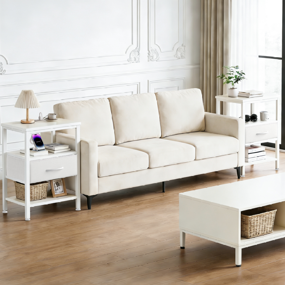 Adjustable and multi-functional storage customizes your space and drawers, which can be installed at two different heights. With three shelves and a fabric drawer added, it offers flexible storage for books, remote controls, glasses and night essentials.