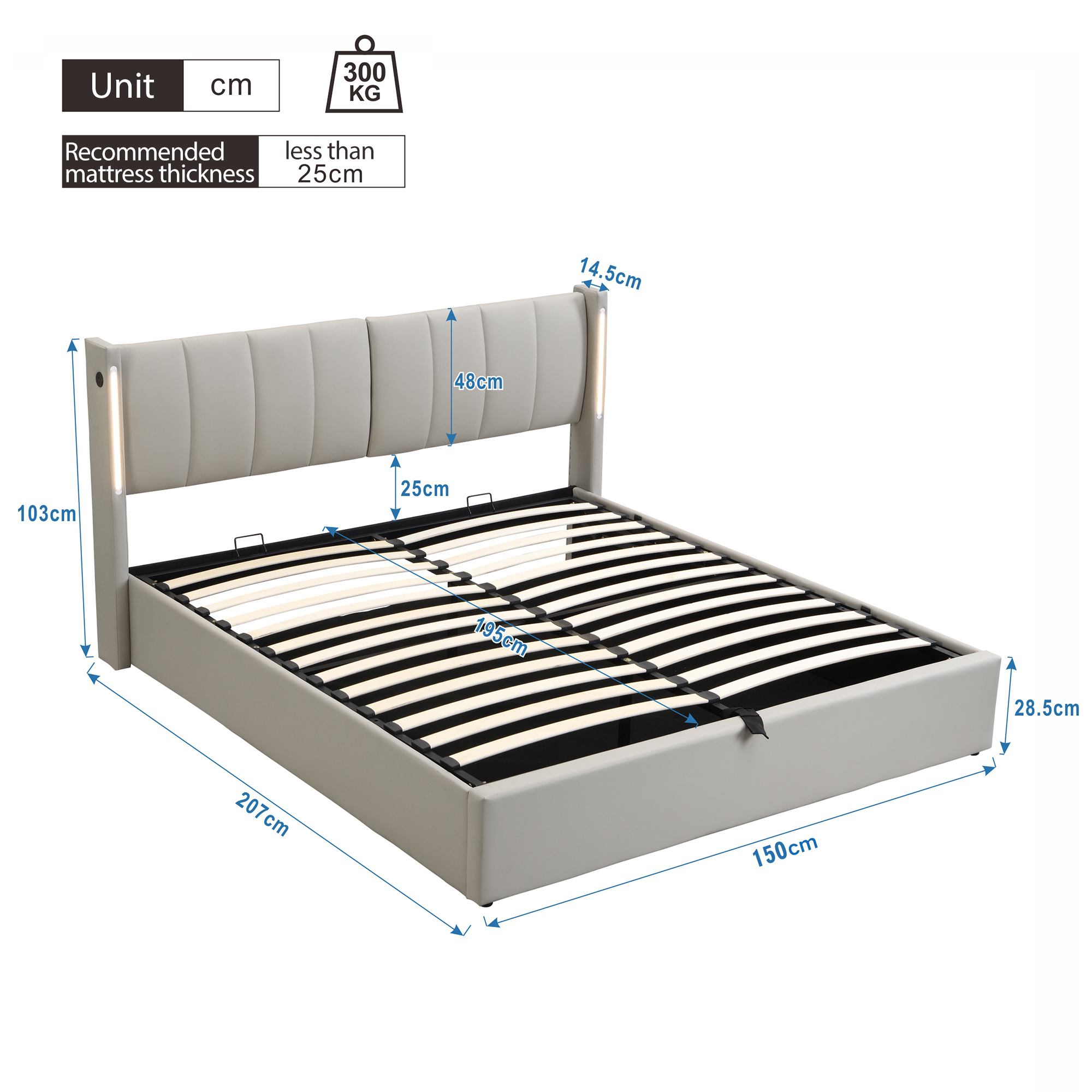 Product Name:LED upholstered bed ,King Size Bed-5ft(150*200cm), hydraulic bed, rechargeable USB port in bed, with LED lighting, with storage space, adjustable headboard, PU , grey