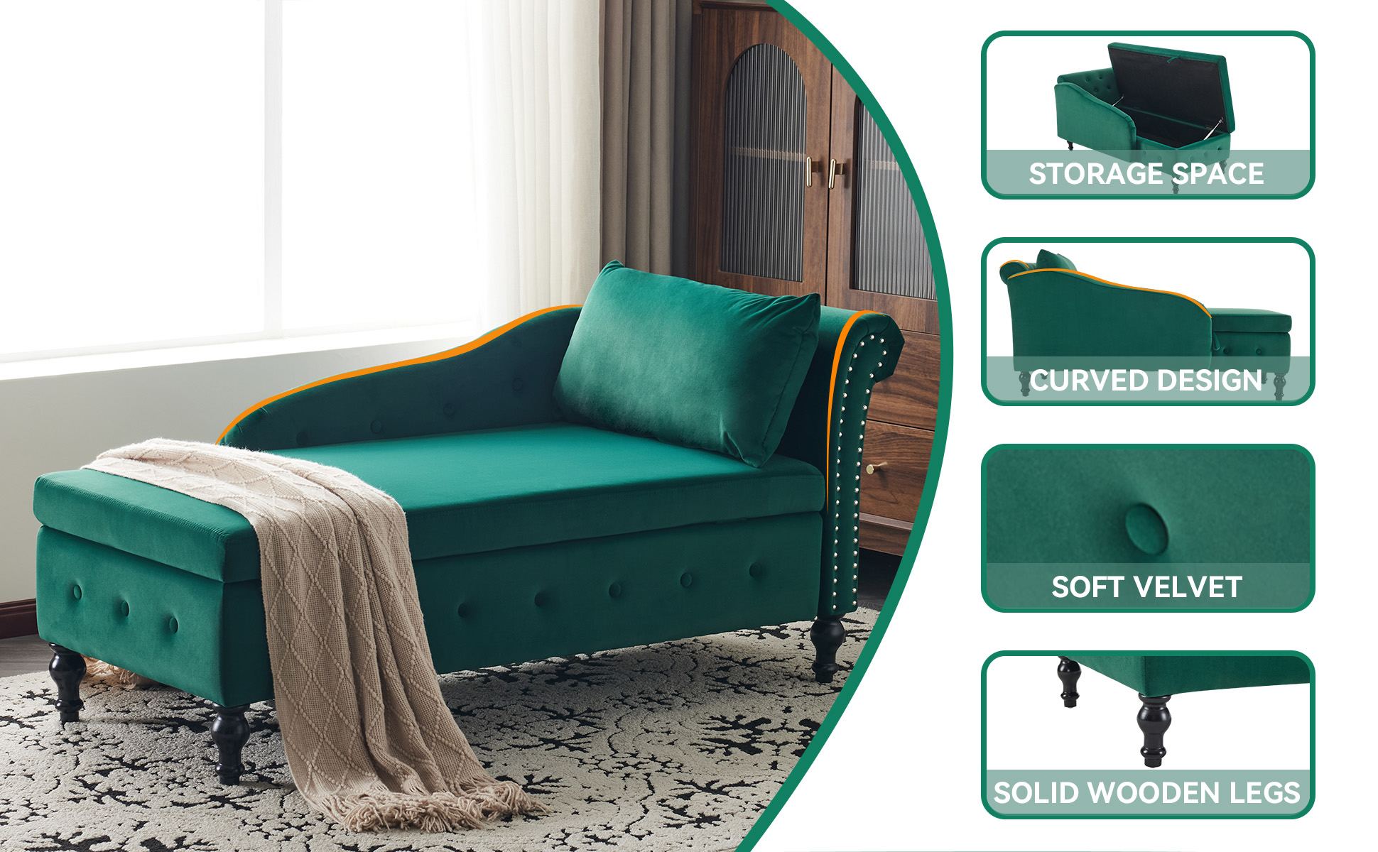 Product Name:Velvet Chaise Lounge Sofa with Storage, Upholstered Chaise lounge Couch with Pillow for Living Room, Modern Nailhead-Trim & Button-tufted Lounge Chair, Bedroom and Office, Right Armrest