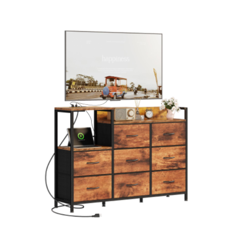 The Wooden Top TV Media Control Console Table Features 8 Fabric Drawers And 1 Shelf. The TV Stand Can Accommodate Up To 45-inch TVS