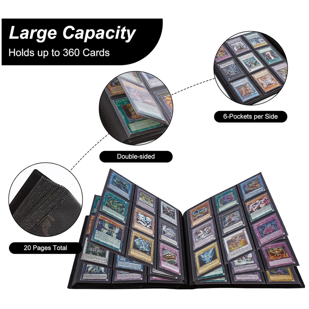 -360 Pockets Card Folder : The trading cards album is 20 pages holding 360 cards (18 pockets per page) Please refer to the picture for size.The packaging does not include the card. Trading card binder is made of high-quality PP material, strong and durable, the cards can be easily inserted and are protected from dust and twisting.