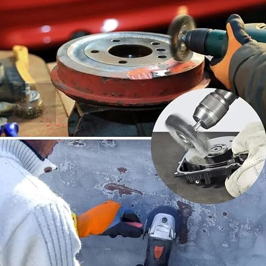 Remove rust or old coatings from metal surfaces. Grinding edge burrs on flat or curved surfaces and for surface brushing of hard stones such as granite.